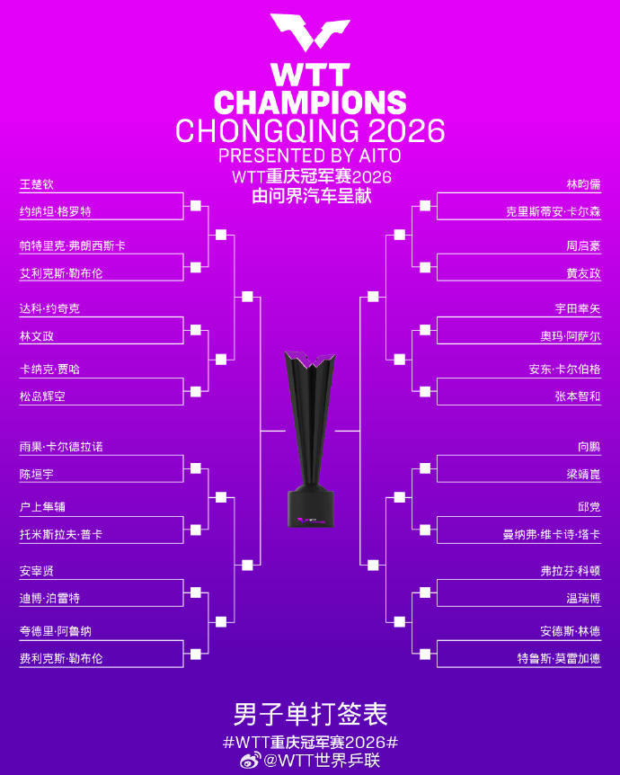 WTT重庆冠军赛抽签结果来了2026年WTT重庆冠军赛抽签结果已于今日(3月8日