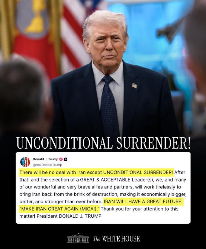 白宫发言人卡洛琳·莱维特在特朗普要求伊朗“无条件投降”后,很快出来解释:只要特朗普认为伊朗不再对美国构成威胁,并且“史诗之怒行动”完全实现目标时,不管伊朗是否承认,都实际上处于无条件投降的状态。