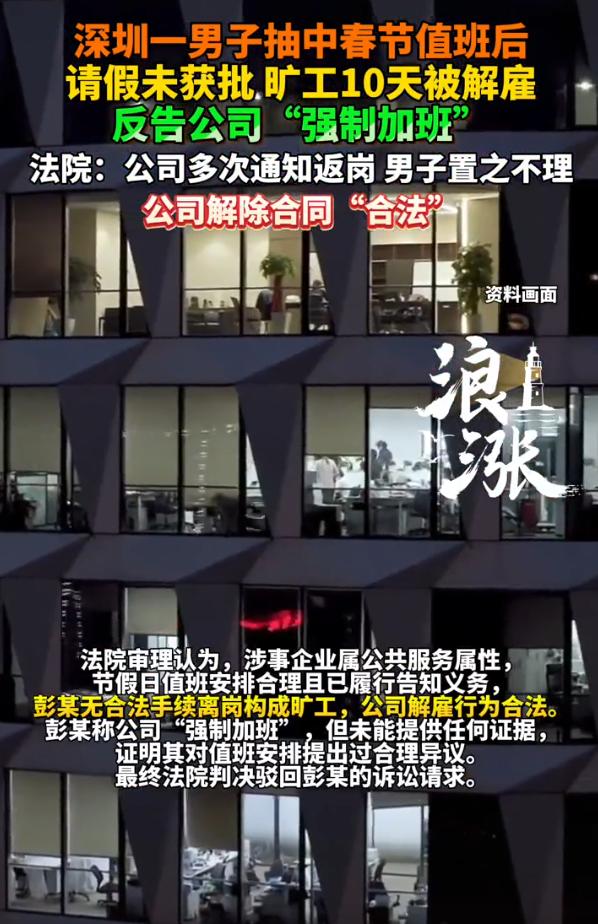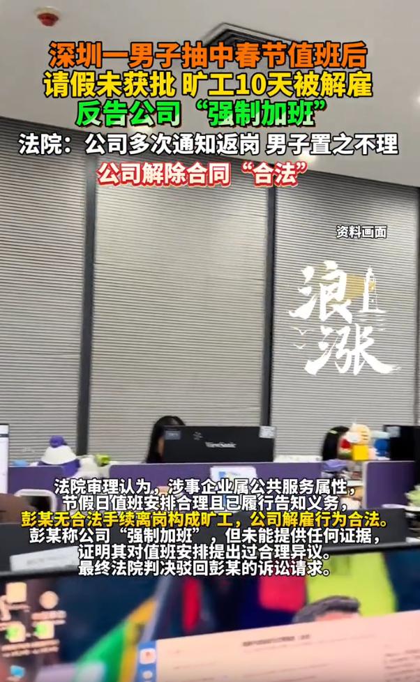 “玩不起?”广东深圳,男子春节在公司抽签时抽中了“春节值班”,按规定需要留下值班,可男子在请假未果后直接撂挑子回家,等回来时直接被告知开除了,而男子反手把公司告上法院,认为公司是“强制加班”,法院判罚结果让人意外 36岁的彭某在一家餐厨垃圾收运公司干活,这工作性质特殊,越是节假日,城市里的垃圾越不能没人管,所以每年春节谁留下值班,大家都靠抽签决定,公平合理,这么多年也就成了不成文的规矩 今年彭师傅手气“壮”,一下抽中了值班签。虽说心里一百个不情愿,但规矩摆在那儿。他还是抱着一丝希望去找领导请假,想通融通融回家过年 结果也不出所料,被拒绝了。毕竟大家都看着呢,要是给彭师傅开了绿灯,这规矩以后就立不住了 按理说,事儿到这儿也就定了,值班就值班呗。可彭师傅心里那团火没灭,他没办任何请假手续,也没跟领导再打招呼,直接就收拾东西回家过年了 从2月5号到14号,公司那边电话打了一遍又一遍,催他回来上班,他愣是没搭理 这一下事情就闹大了。公司一看,这还了得?连续好几天不露面,电话也不接,这不就是典型的长假后“自动离职”吗?最后公司以连续旷工三天以上、严重违反规章制度为由,直接把彭师傅给开除了 彭师傅这下傻眼了,他觉得冤枉啊:明明是公司春节不人道,强制我加班,我不干了还不行?一气之下,他把公司告上法院,要求支付违法解除劳动合同的赔偿金 法院一审,结果出来了,却让很多人有点意外:彭师傅败诉了。法院驳回了他的诉讼请求,意思是公司开除他,合法 有网友表示:假期去上班,没有三倍工资 ,不让请假,这不是加班吗? 这里面其实藏着容易搞混的一个关键点:加班和值班,这其实不是一回事 加班,是你本职工作的延续,干的活儿跟平时一样累,甚至更累。所以法律规定了,加班必须给高额加班费,尤其是法定节假日,得给三倍工资 但值班呢,性质不太一样。它通常是因为单位有安全、消防、应急或者保障公共运行的需要,安排人守着。工作强度没那么大,主要是应对突发状况 像彭师傅这种餐厨垃圾收运,属于城市运行保障的一部分,春节必须有人收垃圾,不然城市就臭了 法院在判的时候就认定了这一点,认为公司这种安排是合理的,而且抽签决定也是大家之前都认可的 所以,彭师傅眼里的是强制加班,但在法律认定上,这就是一次合法的、必要的值班安排。而这个判罚结果,就不意外了