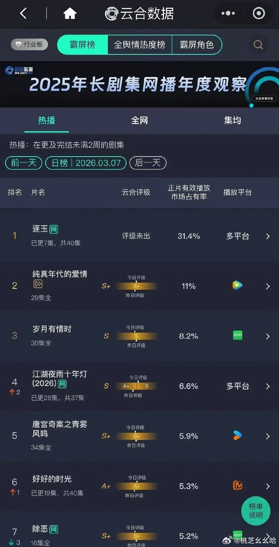 逐玉走势逐玉走势 首日热度是成毅的《赴山海》,开播三天已经超张译的《狂飙》了……
