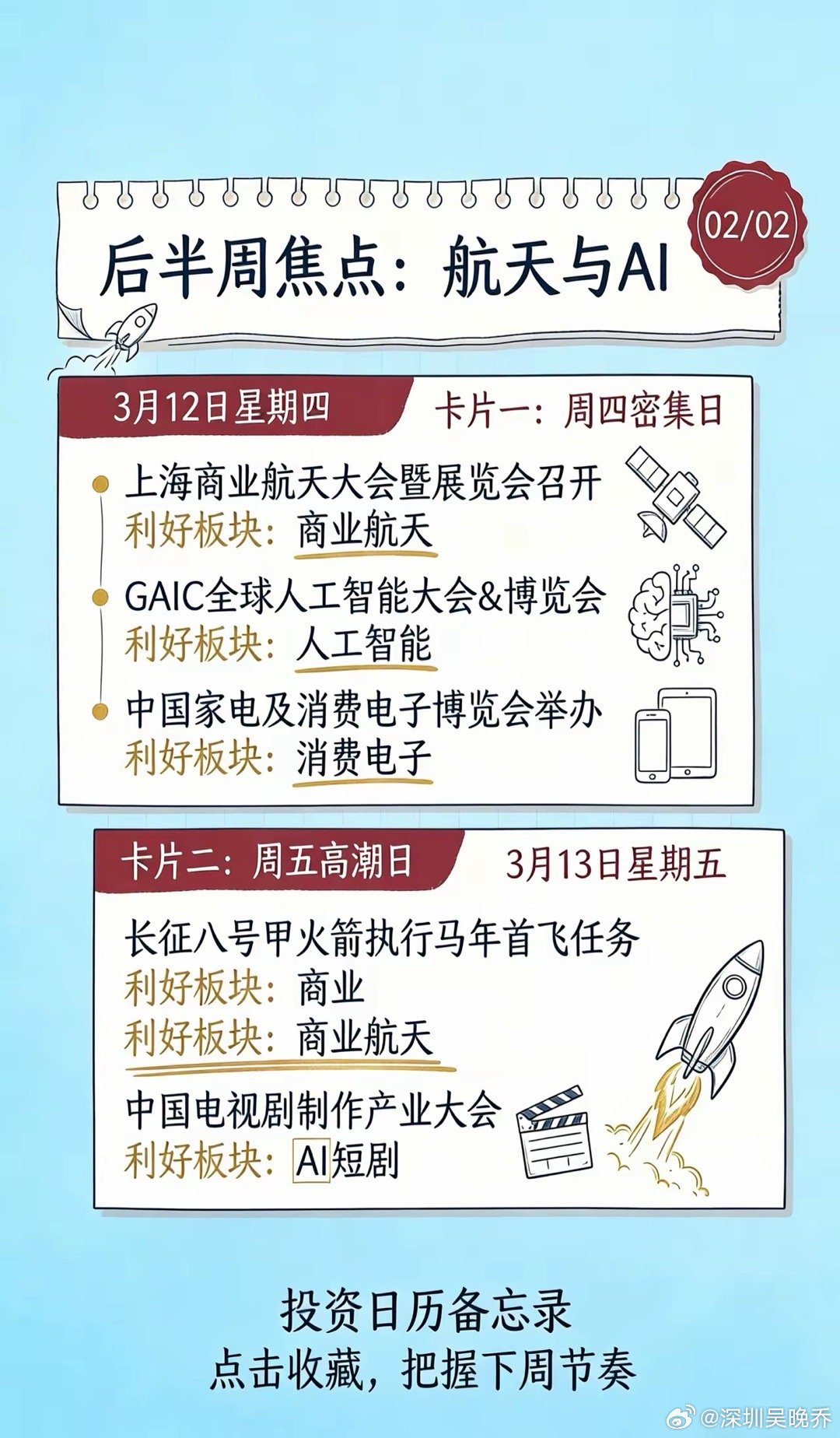 下周(3.9-3.13)投资日历:四大主线机会梳理📅下周市场将迎来密集的行业会议与重磅事件,从光储、机器人到商业航天、AI,多条主线机会清晰浮现,帮你提前锁定节奏👇🔹 周一(3.9):光储大会启幕• 中国国际光储利用大会举办,利好光伏储能板块。• 看点:关注储能技术迭代、政策落地及出海订单进展。🔹 周二(3.10):机器人圆桌会议• 美商务部召开机器人制造圆桌会议,利好机器人板块。• 看点:全球产业链协作、人形机器人商业化进程。🔹 周三(3.11):机器人+天然气双主线• 第三届中国具身智能机器人产业大会:聚焦具身智能落地,利好机器人。• 中国天然气产业发展大会:关注供需格局与价格机制,利好天然气。🔹 周四(3.12):密集事件日• 上海商业航天大会:利好商业航天。• GAIC全球人工智能大会:AI技术与应用落地,利好人工智能。• 中国家电及消费电子博览会:消费电子新品与技术升级,利好消费电子。🔹 周五(3.13):高潮日• 长征八号甲火箭马年首飞:商业航天里程碑,利好商业航天。• 中国电视剧制作产业大会:AI短剧创作与产业升级,利好AI短剧。💡 投资备忘录• 核心主线:商业航天(周四+周五双催化)、AI(大会+短剧)、机器人(连续三天事件)。• 操作建议:关注事件前的预期发酵,以及会后的订单与技术落地兑现。下周市场节奏清晰,提前布局,把握主线机会!🚀以上信息仅供参考,不构成任何投资建议~