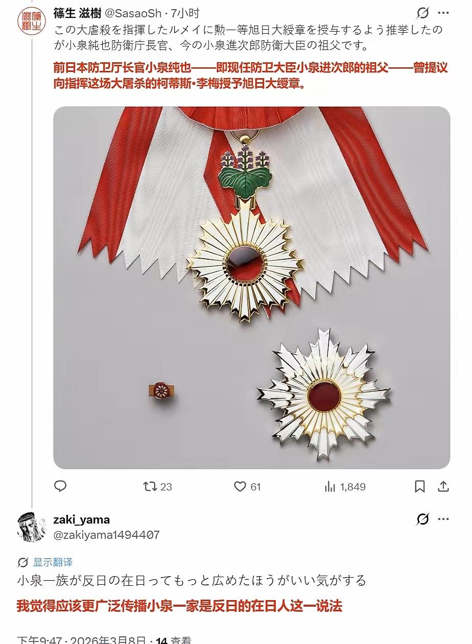 警惕日本利用二战烟幕掩盖自己的罪行,把日本扮演成受害者 明天就是3月10日,1945年这一天天没亮,美军B29对东京进行了号称史上最大的一次轰炸,造成熊熊大火,日本木结构心与房子,一起燃烧。此次行动指挥官是李梅将军,于是这就是历史上著名的的“李梅烧烤”。 怨有头债有主,事情都是有来龙去脉的。日本帝国主义侵略亚洲等地,加害于周遍国家,九一八七七事变,南京大屠杀,偷袭珍珠港,日本普通人等在日军攻城略地后大呼“万岁万岁”的时候,应该明白他们在做什么,也应该明白这一切的后果。世界人民对日本的反击是正当的,日本军国主义永远在人类正义事业的对立面,需要时刻警惕它的死灰复燃。 实际上李梅烧烤虽然烧透了日本的肉,没有烧死日本的心,日本仍然没有投降,后来又来了个小男孩和胖子,才有些高温效果,加之苏联红军登场了,才有玉音了。 战后的后来,现在的防相小泉进次郎的爷爷建议给指挥轰炸的李梅将军一枚旭日大勋章,那么就是支持李梅的行动与功绩了,日本为什么在3.10这个日子来到前还喋喋不休呢?