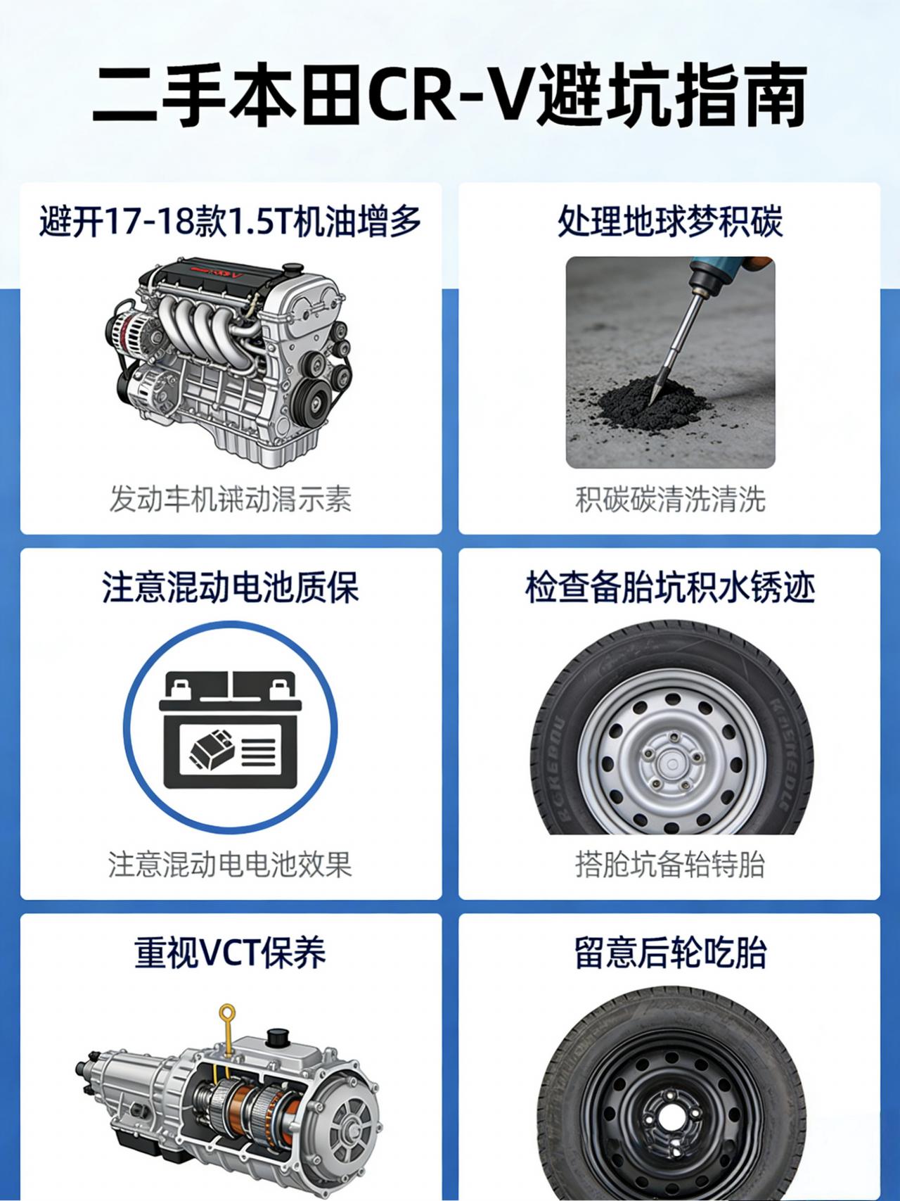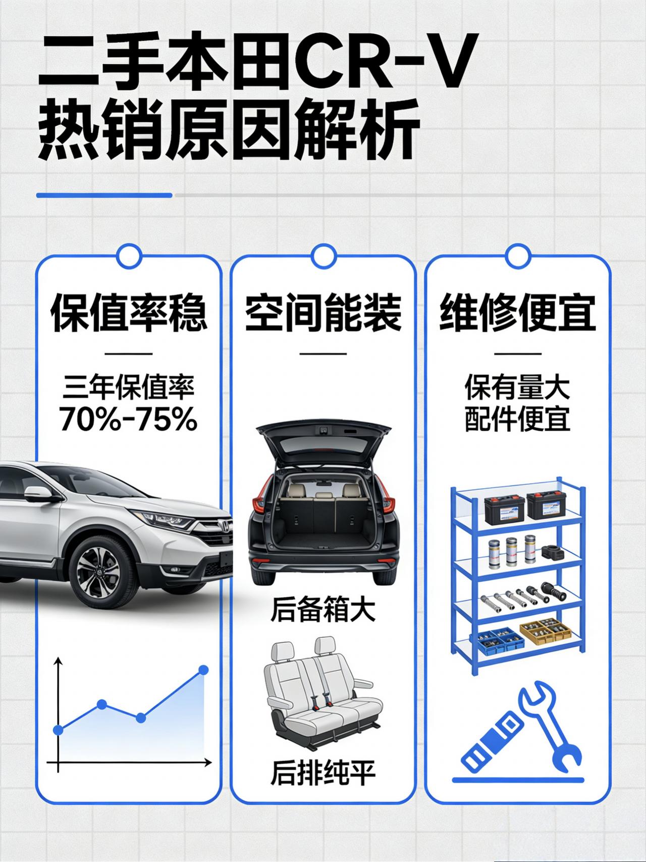 二手本田CR-V行情盘点:5万-15万各年款怎么选直接告诉你 说起二手SUV,有一款车你绝对绕不开——本田CR-V。 这车不帅不快,开出去没人回头多看两眼。但你问十个修车师傅,九个会告诉你:买这车,闭着眼都不会错。 为啥?就仨字:省心、能装、不肉疼。 先看行情,你对号入座 👉2012-14款 第四代(2.0L/2.4L) · 行情:3.5万-7万 · 特点:经典老款,皮实耐造,预算三四万的首选 👉2015-16款 第四代中期(地球梦2.4L) · 行情:5.5万-9万 · 特点:换了地球梦发动机,动力更好,油耗更低 👉2017-19款 第五代(1.5T/混动) · 行情:8万-14万 · 特点:颜值提升,混动版省油,家用首选 👉2020-21款 第五代中期 · 行情:10万-16万 · 特点:车龄新,配置高,跟新车体验差不多 👉为啥二手CR-V这么火? 第一,保值率是真稳。 三年保值率70%-75%,在燃油SUV里基本是天花板。我朋友2019年买的混动,落地23万,开了5年现在还能卖12万左右。比起某些车“三年腰斩”,这已经相当能打了。你开三年想换车,亏的钱比别人少,这就是真金白银的好处。 第二,空间是真能装。 后备箱大,后排地板纯平,拉人拉货都行。有孩子的家庭最有感触,婴儿车、安全座椅往里扔就完了,从来不操心空间不够。周末带全家出门,五个成年人坐着都不挤,这价位你找几台车能做到? 第三,维修是真便宜。 保有量大,路边摊都会修,配件便宜到离谱。CR-V车主最常说的一句话就是:除了正常保养,想不起来去修车店。不像有些冷门车,换个灯泡等半个月,修一次顶半年油钱。 👉各年款怎么选?实话实说 👉2012-14款:预算三四万 2.0L和2.4L自吸,皮实耐造,维修便宜。缺点是内饰老气、油耗偏高、隔音差。适合手头紧、想要个遮风挡雨靠谱车的朋友。看车重点查2.4L烧不烧机油,变速箱油换过没。记住一句话:这个价位,买的是“能开得住”,不是“开着爽”。 👉2015-16款:预算六到八万 换了地球梦2.4L,动力更猛,油耗低1-2个。CVT变速箱平顺多了。缺点是积碳问题明显,得定期清洗节气门。适合想要动力好点、能接受定期保养的。买之前一定问清楚积碳洗过没。这代性价比其实挺高,比老款开着舒服,又比新款便宜不少。 👉2017-19款:预算十万左右 大换代,颜值年轻了。1.5T动力够用,混动版市区油耗5个多,一箱油跑八九百公里。缺点是17-18款1.5T有机油增多,19款之后好多了。混动电池在后排座下面,后备箱高度受点影响。适合家用首选,重点看19款之后的1.5T或混动。混动版虽然贵一两万,但开三年省下的油钱就补回来了。 👉2020-21款:预算十三万以上 中期改款,配置升级,L2辅助驾驶、大屏都有了。缺点是价格偏高,车况好的要16万。适合想要准新车、开两三年就换车的,保值率高亏得少。说实话,这个价位有点尴尬,再加两三万能上新款了。但如果你不想交购置税,又想体验最新配置,那就选它。 👉这几个坑你得躲开 一、1.5T机油增多(17-18款) 查查有没有召回记录,冷车看看机油尺有没有乳化。最好选19款之后的,问题基本解决了。 二、混动电池 五代混动有十年或20万公里质保,买之前一定问清楚原厂质保还能不能跟车走。万一脱保后电池坏了,换一套一万多,够你加两年油了。 三、CVT保养 CVT变速箱就怕不保养。买车时问问油换过没,没换的买回来赶紧换,能多开好几年。这钱不能省。 四、地球梦积碳(2.4L) 15-16款2.4L积碳明显,看车时问问节气门洗过没,有没有抖动、怠速不稳。有记录的最好,没有的话买回来就得准备几百块洗一次。 五、备胎坑 掀开垫子看看有没有积水锈迹,泡水车最容易在这儿露馅。水渍、泥沙、锈蚀,有一个算一个,都得留个心眼。 六、后轮吃胎 摸摸后轮内侧,磨损比外侧严重的话,定位有问题,得花钱修。这毛病不算大,但能砍价。 👉最后几句大实话 CR-V开着确实没啥激情。但它就是那种你不用操心的车。你买它不是为了爽,是为了不用半夜叫拖车,不用为了修车请半天假,不用担心卖的时候没人要。 想要驾驶乐趣,别选它。想要省心、能装、开到哪儿都不怕,它就是最稳的答案。在二手车市场混了这么多年,我越来越明白一个道理:车是给人服务的,不是让人伺候的。 现在价格下来不少,去市场转转吧,这车源多,多看几台,找个懂行的朋友把把关。记住,二手车是一车一况,别着急,总能碰到那台有缘分的。 (注:以上价格参考2026年3月行情,具体以实际车况为准。买车前一定查维保记录,1.5T的查机油增多处理,混动的查电池质保。)【来自懂车帝车友圈】