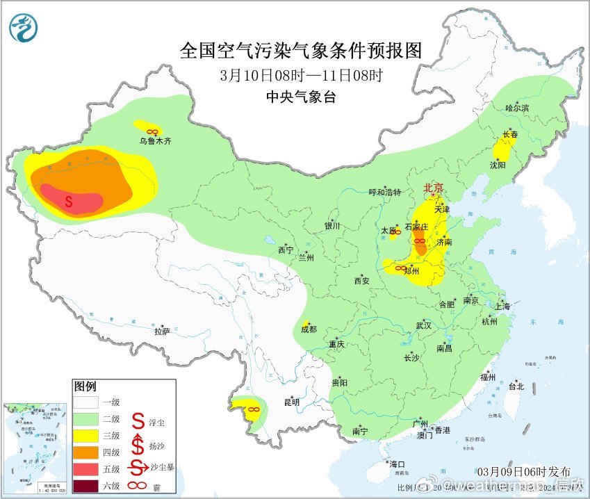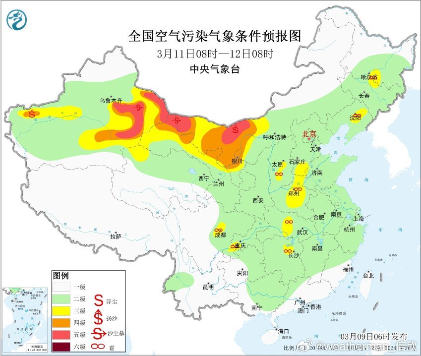 另外新疆塔里木盆地的沙尘,今晨有所减弱。但今明沙尘还不会彻底结束。而且11日以后因为有强冷空气东移,在冷锋后侧的新疆东部、冷锋前侧的甘肃西部、内蒙古西部,均可能因为有大风,导致起沙。而且12-13日沙尘可能还会波及到甘肃、宁夏、陕西更多的地方。