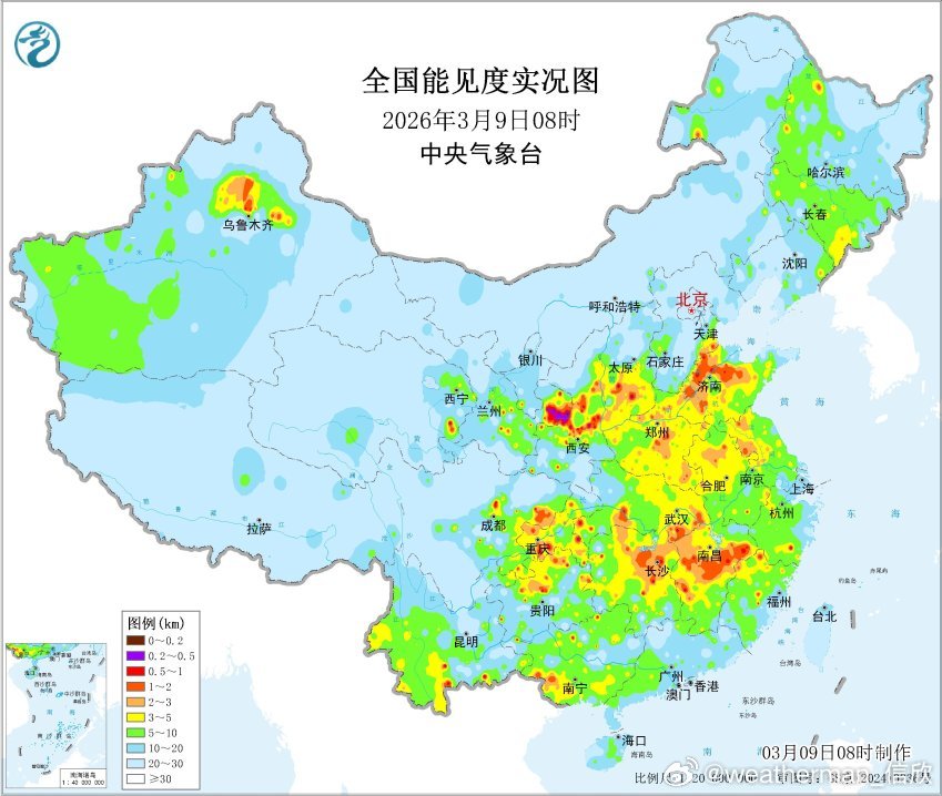 【雾 霾 沙尘】今晨零散分布着一些大雾天气,部分省市8时能见度最低站点:湖南南岳27米、安徽黄山45米、河南嵩山47米,均为特强浓雾;四川峨眉山51米、云南屏边72米、陕西合阳77米、甘肃镇原110米、山西安泽117米、重庆秀山123米、贵州息烽144米、山东宁津154米、湖北三峡168米,为强浓雾。