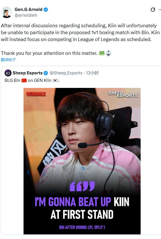 经过内部对于日程安排的相关讨论,Kiin非常遗憾将无法参加原定与Bin选手的1v1拳击赛。Kiin将按计划专注于英雄联盟赛事。