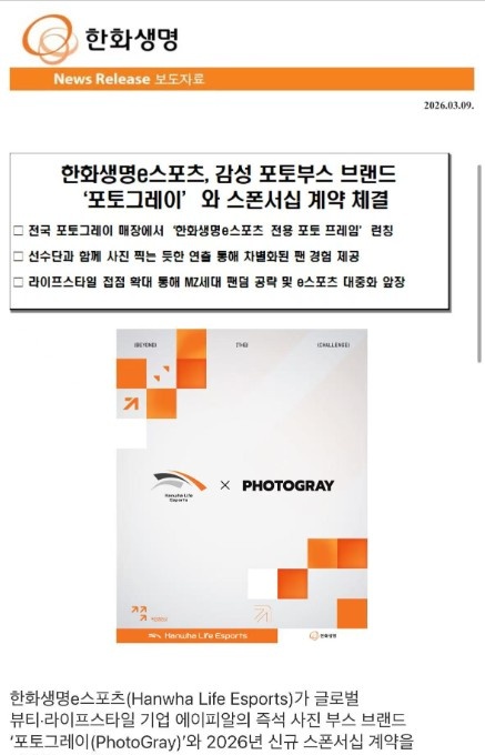 直播吧3月9日讯韩华生命eSports(HanwhaLifeEsports)表示,已与全球美妆·生活方式企业APR旗下即时照片亭(人生四格)品牌PHOTOGRAY签订了2026年新的赞助合作协议。