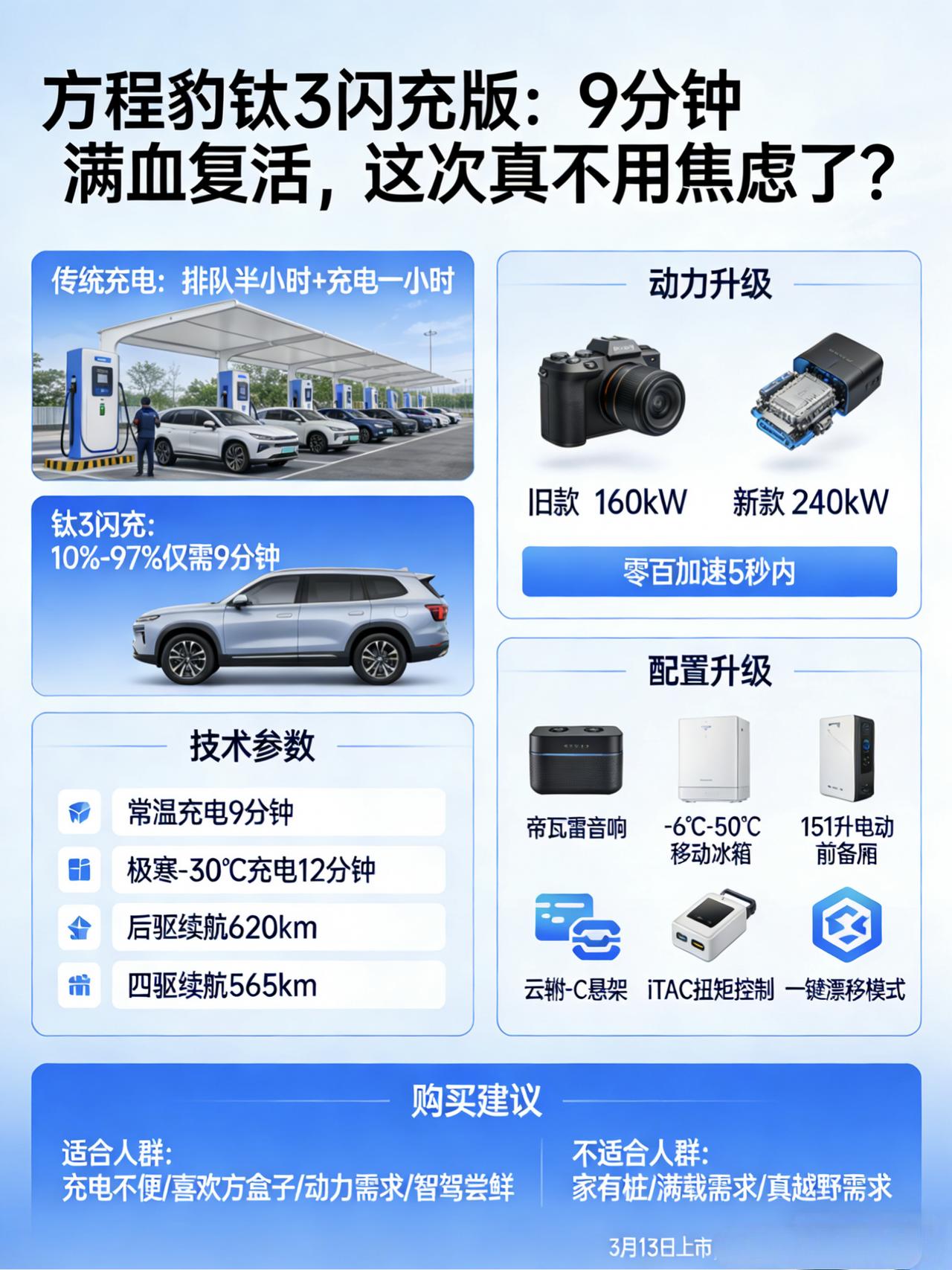 方程豹钛3闪充版:9分钟满血复活,这次真不用焦虑了? 说实话,我最近有点被充电搞麻了。 上周去郊区玩,回程想着补个电,服务区四把枪两把坏的,一把被油车占着,排队半小时、充电一小时,原本两小时的路硬生生跑了四个钟头。当时就在想:啥时候充电能像加油一样快? 结果昨天刷到消息,方程豹钛3闪充版3月13日上市,官方说从10%充到97%只要9分钟。 9分钟?比我蹲坑时间还短。 先说说这个“闪充”到底有多猛 这次钛3闪充版最大的卖点,就是上了比亚迪第二代刀片电池+兆瓦级闪充技术。 数据是这样:常温下10%到97%充电9分钟,零下30℃的极寒环境,20%到97%也只要12分钟。后驱版续航620公里,四驱版565公里。 我算了一下,9分钟充进去的电,够我从北京开到济南还剩一半。以前跑长途得规划充电站,以后可能得规划“哪家服务区咖啡好喝”——因为就一杯咖啡的功夫。 但得说句大实话:这技术依赖专用闪充桩,不是说随便找个充电桩都能这么快。比亚迪说全年要建2万座闪充站,但覆盖到全国还得时间。如果你家附近没有,或者主要用家用桩,那这个“9分钟”对你来说就是个数字。 价格涨了,但涨在哪? 网上曝光的售价是后驱版16万、四驱版18万。对比现款钛3(13.38万起),后驱贵了1万,四驱贵了1.5万。 涨价这事,现在这行情确实有点反人性——大家都在卷价格,你倒好,反向操作。 但仔细看升级点,这钱花在哪了? 第一,电机换了。后驱电机从160kW直接干到240kW,四驱版前后135kW+240kW。一台紧凑型SUV塞进去这动力,零百加速能跑进5秒内,推背感绝对够用。 第二,电池大了。75.6kWh第二代刀片电池,续航620公里。比现款后驱多跑几十公里,关键是充电速度翻倍了。 第三,智驾能选了。终于可以选装激光雷达,上天神之眼B系统,支持城区NOA和高速NOA。以前比亚迪系被吐槽最多的就是智驾拉胯,这次算补上了。 第四,配置堆了不少。帝瓦雷音响、-6℃到50℃的移动冰箱、151升电动前备厢、云辇-C悬架、iTAC扭矩控制、一键漂移模式。这些以前得二十大几万才给的东西,现在下放到16万级了。 这么看,涨的一万块钱,买的是动力翻倍+闪充+智驾入场券+一堆配置。不算亏,但值不值,得看你是不是用得着。 谁适合买?谁不适合? 钛3这车定位挺有意思——方盒子造型、硬派风格,但它不是带大梁的真越野。豹系列才是干粗活的,钛系列主打城市通勤+周末郊游。 说白了,给你提供的是硬派的情绪价值,不是真让你去豁沙子。 适合谁? · 充电不方便、依赖快充的人:闪充是真能救命 · 喜欢方盒子造型、想要回头率的年轻人 · 对动力有要求、想要偶尔爽一把的 · 想尝鲜高阶智驾、但预算有限的 不适合谁? · 家里有桩、主要市区代步的:多花一万买闪充,可能几年都用不上 · 经常满载五人、家里有大高个的:2745mm轴距,后排腿部空间只能说够用,不是越级那种 · 想要真越野的:别被它外表骗了,这不是豹5 最后说几句 这车3月13日上市,全国53城92家经销商已经有展车了。想买的可以去摸摸实车,尤其是后排坐半小时,看看空间和座椅能不能接受。 我自己的看法是:技术方向是对的。纯电车最大的痛点从来不是续航短,而是充电慢。你续航1000公里,但充一次俩小时,出远门照样焦虑。反过来,续航600公里但充电9分钟,跑长途反而更有底气。 但现实问题是:闪充桩还没铺开之前,这技术对你来说是不是刚需?如果家里有桩、平时不出远门,买现款钛3省一万多块钱,其实更划算。 车是好车,比亚迪这次确实把高端技术下放得够狠。买不买单,看你右脚对速度的渴望有多深,也看你家附近的闪充桩啥时候到位。 (注:以上信息综合自2026年3月公开报道,具体参数和价格以上市发布为准。本文仅代表个人观点,非专业导购建议。)【来自懂车帝车友圈】