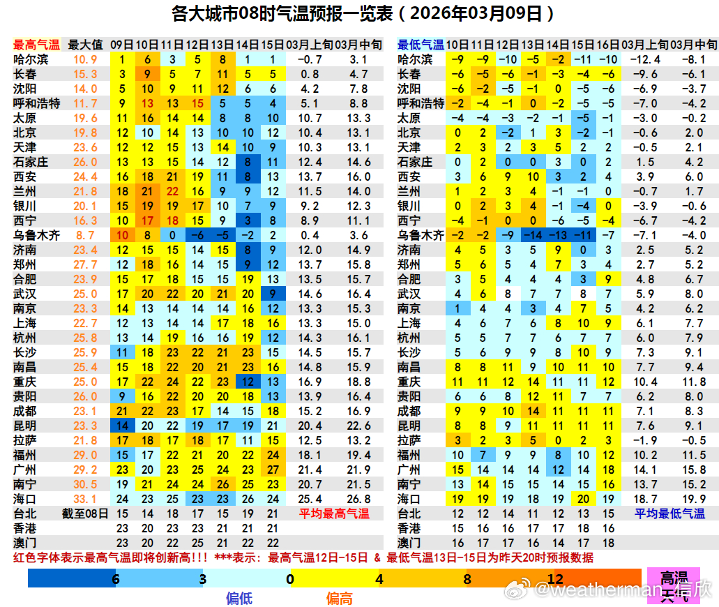 【一周天气——起伏波动大】本周(3月9日-15日)冷暖空气都很活跃,且实力不俗。降水先少后多,气温先升后降。10-11日将是本周中东部晴朗范围最大的时段,但11-15日因为全能型冷空气到来,我国自西向东出现雨雪、降温。而且西北等地还有大风、沙尘。西北地区将是本周天气反差最大的区域。