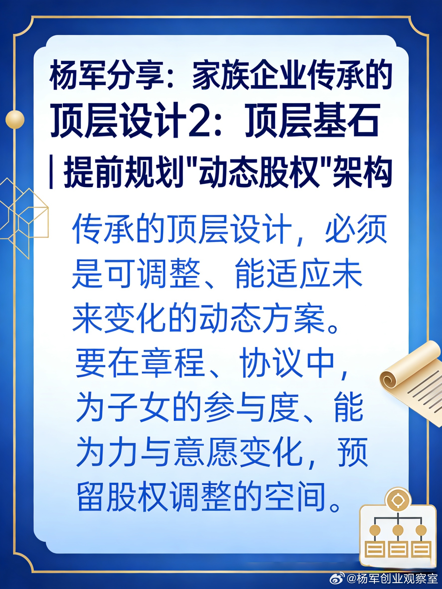 2.动态股权:提前在章程中设计“可调整”的股权架构,为子女未来参与度、能力变化留空间。