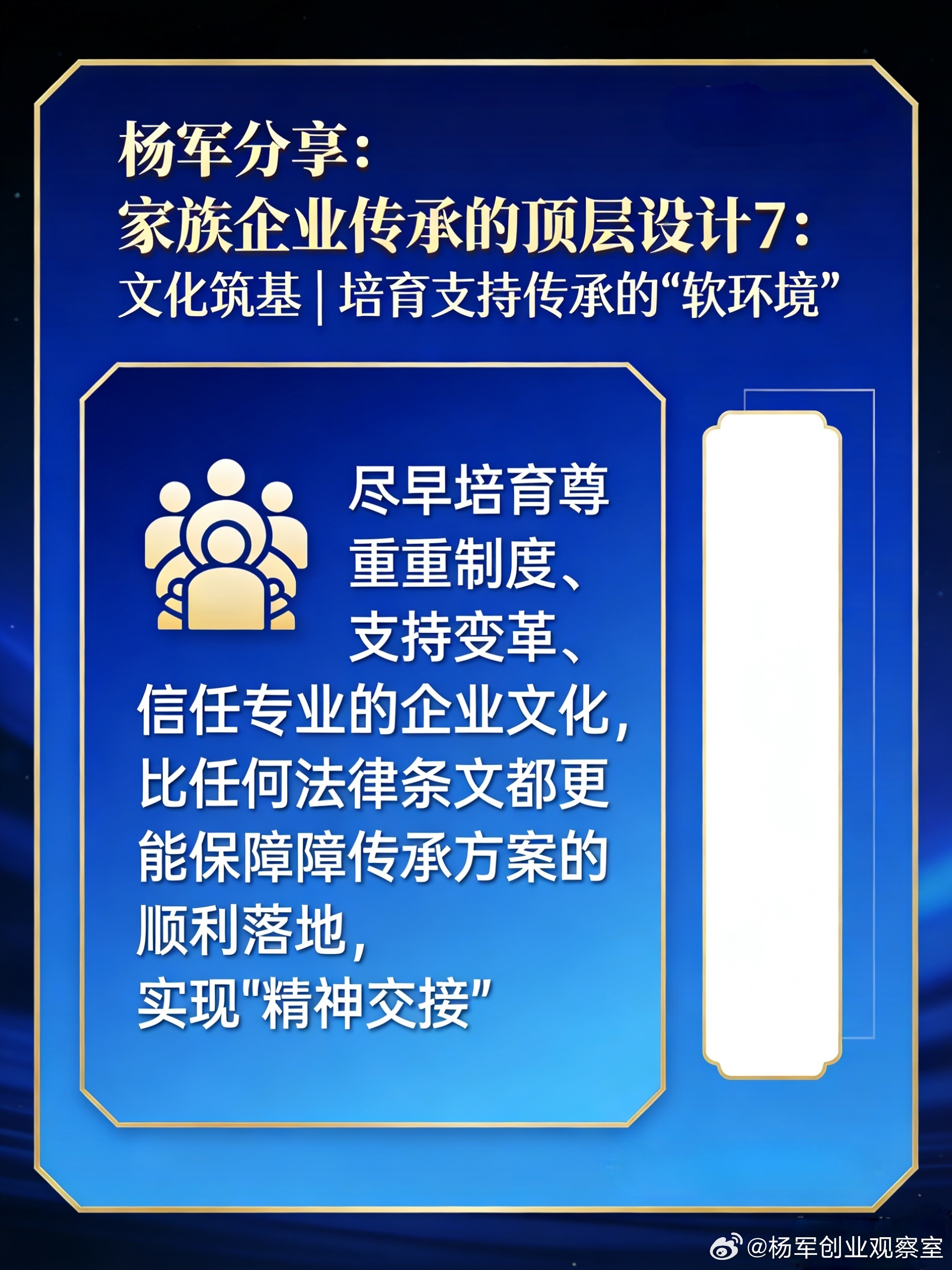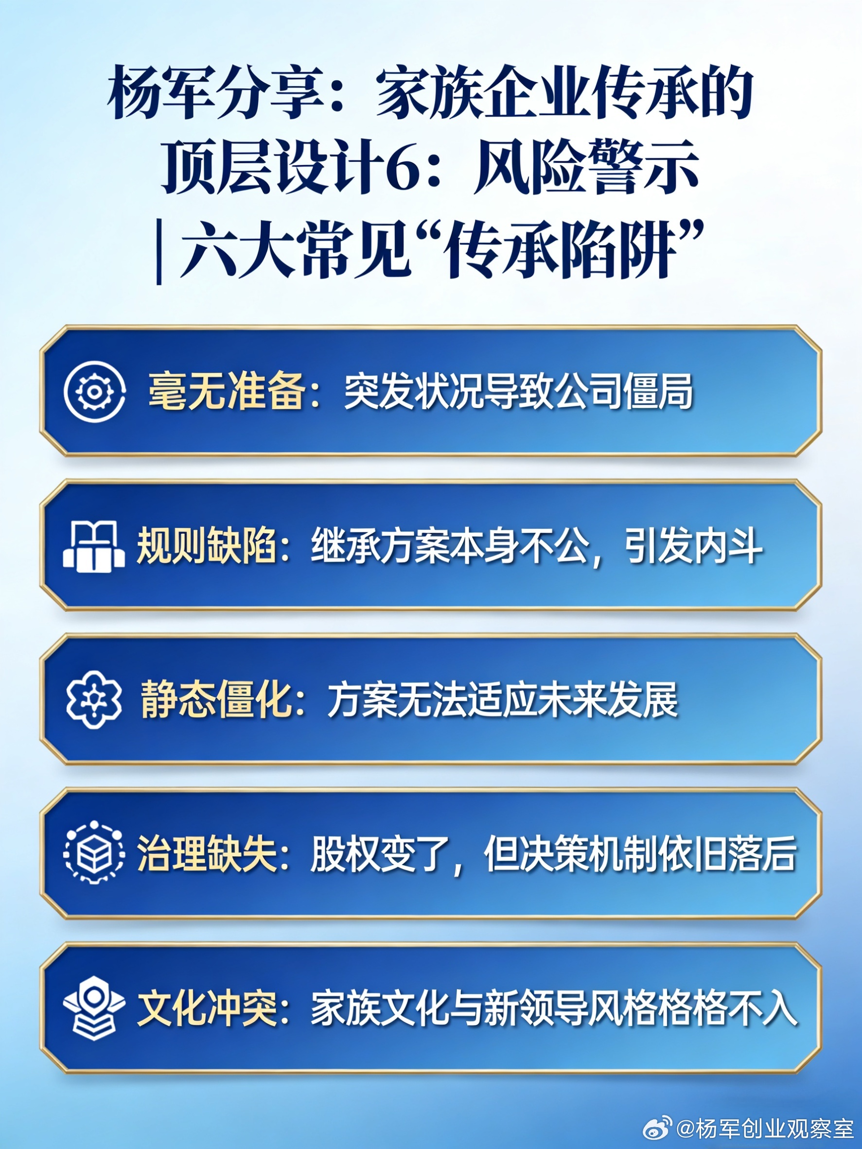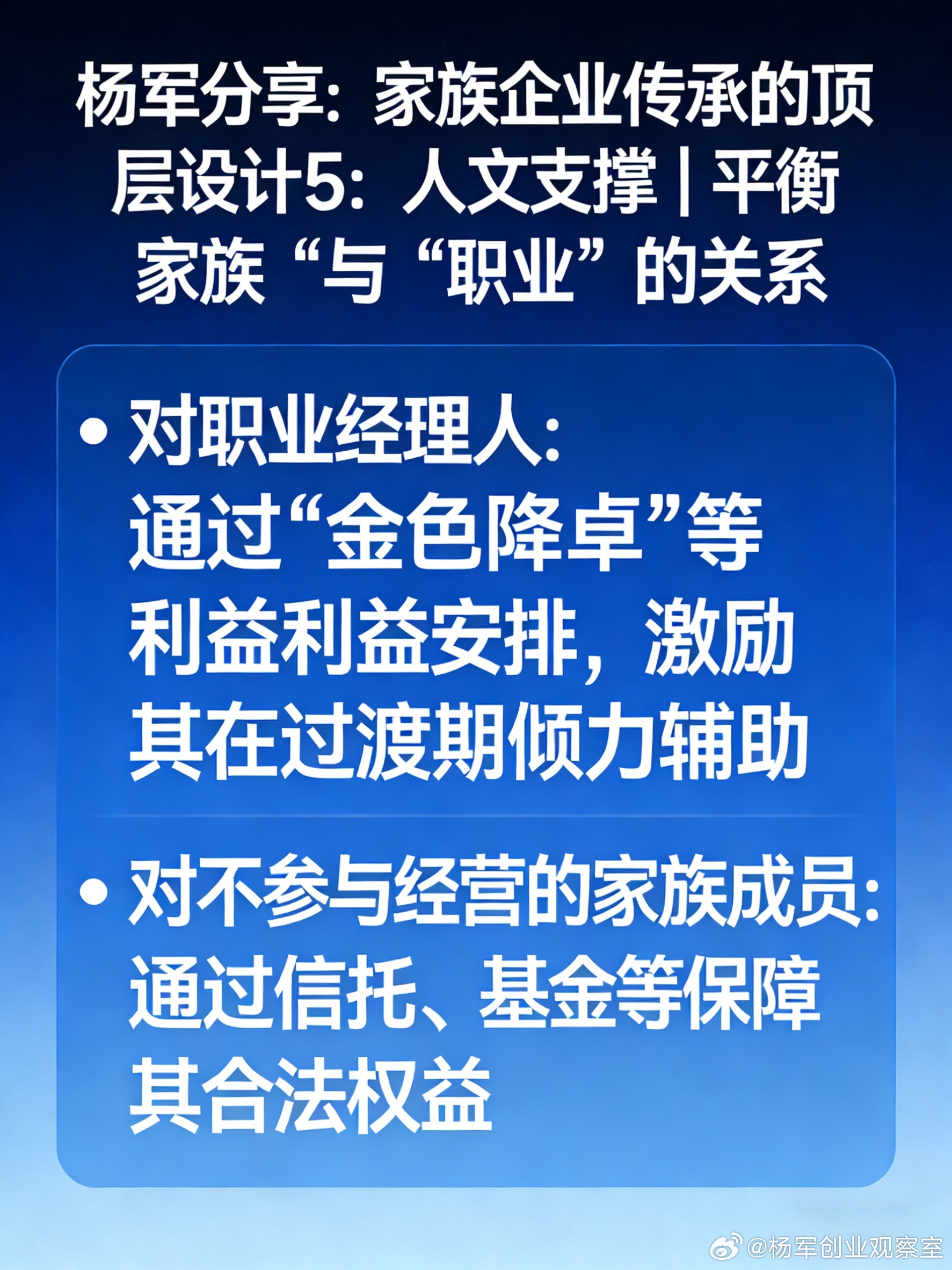 5.平衡关系:对职业经理人,设“金色降落伞”激励辅助;对家族成员,通过信托/基金保障权益。
