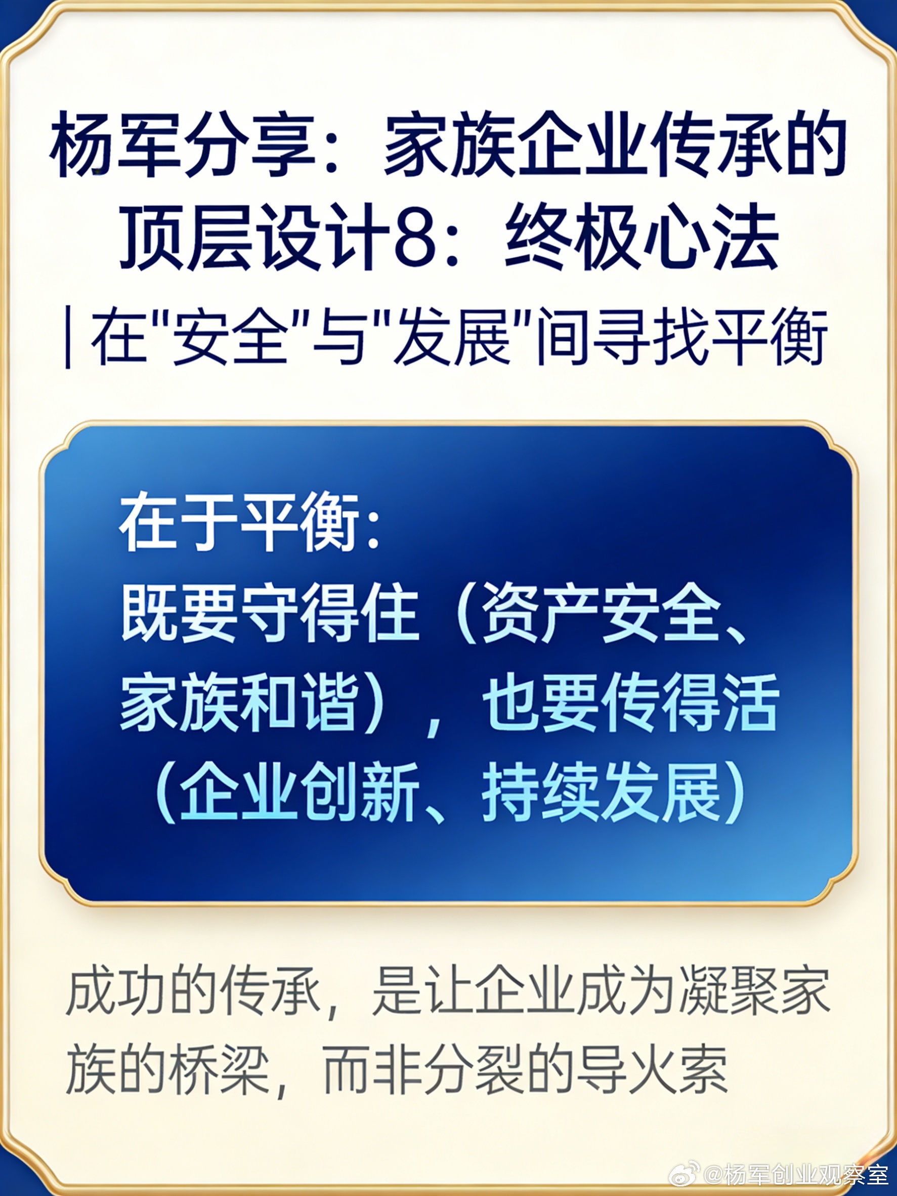 8.终极心法:在“安全”(资产、和谐)与“发展”(创新、持续)间找到平衡,让企业成为凝聚家族的桥梁。