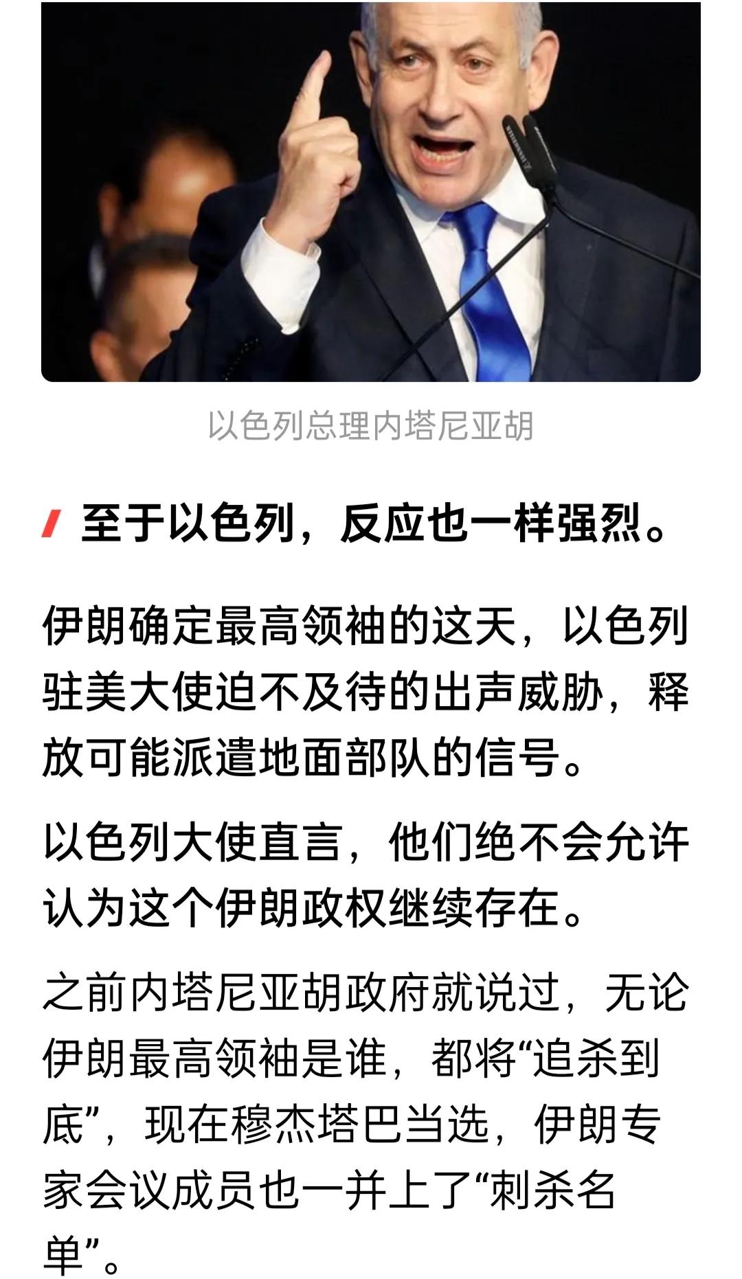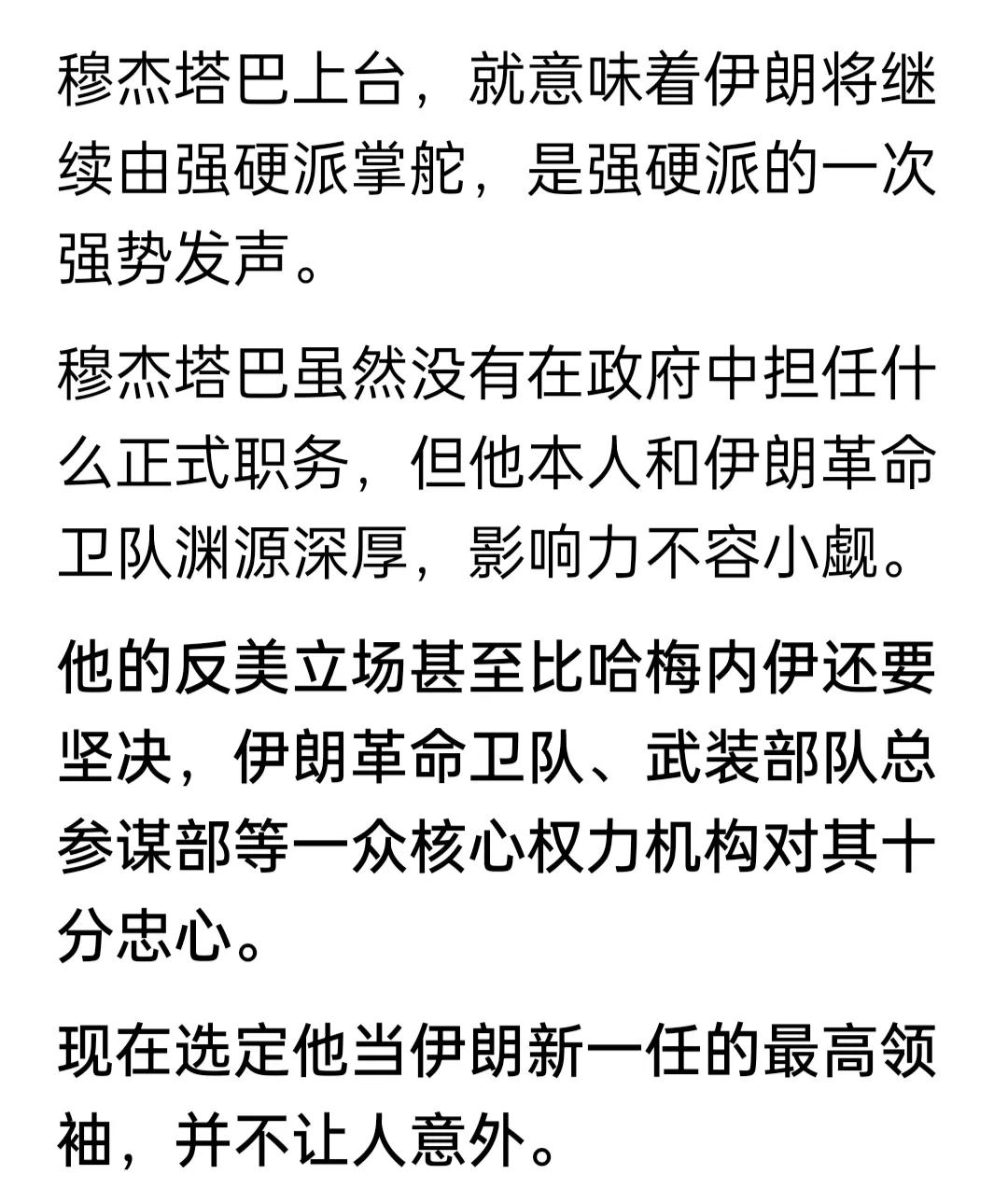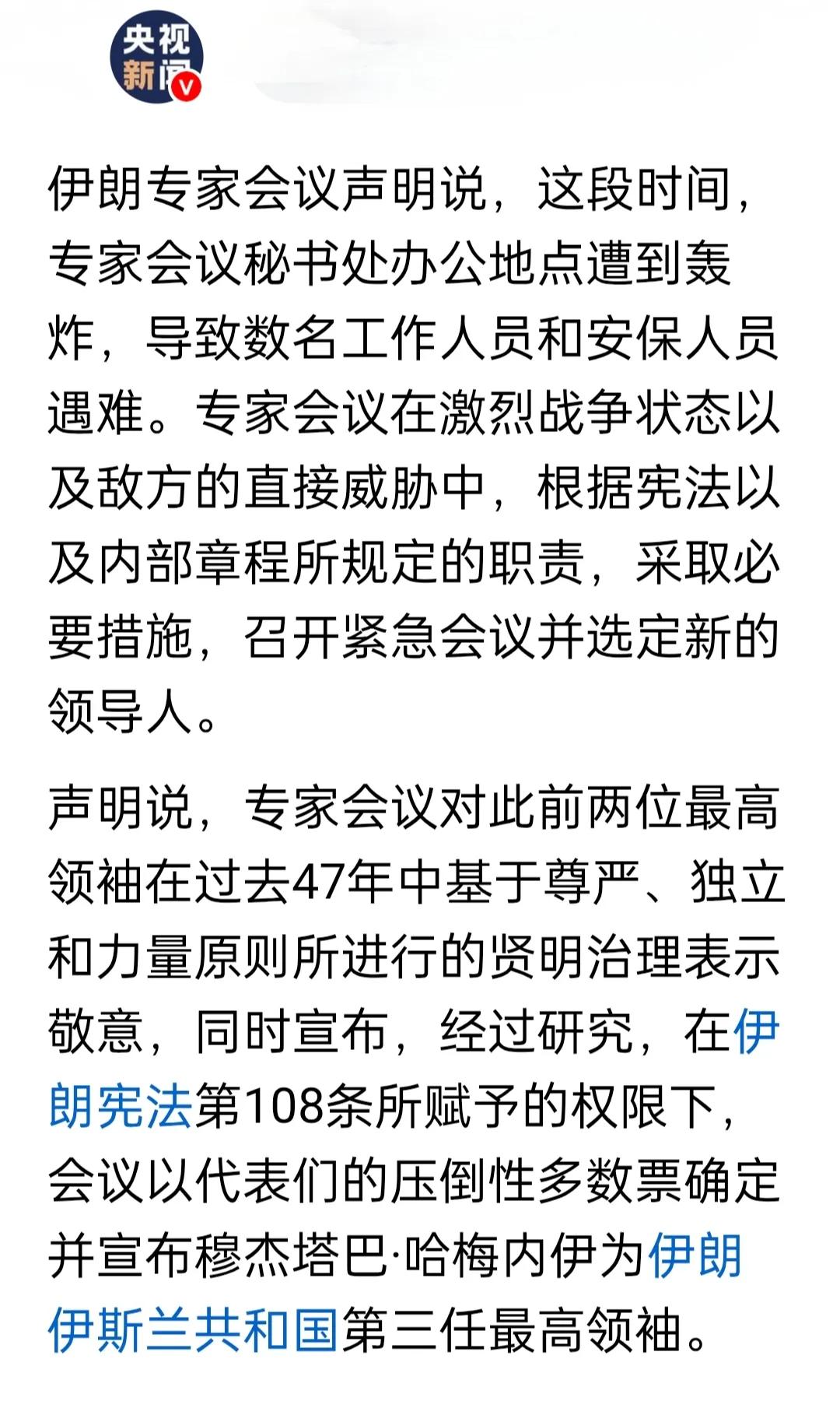穆杰塔巴接棒任伊朗最高领袖,是伊朗当下内外因素刺激下的必然选择,伊朗与以色列的世仇将持续难解 伊朗专家会议声明“在激烈的战争状态以及敌方的直接威胁中,根据宪法以及内部章程所规定的职责,选定新的领导人”,确定让穆杰塔巴·哈梅内伊担任伊朗的新任最高领袖。 伊朗专家会议的声明,着重强调:1、战争状态,2、面临敌方直接威胁,3、根据宪法以及内部章程。可以理解为,在战争状态下硬抗敌方威胁,依法选出国家的新任最高领袖,决不投降,将继续抵抗美国和以色列的侵略。 此前,伊朗驻俄罗斯大使贾拉利在接受全俄国家电视广播公司采访时指出“一个仅拥有250年历史的国家(美国),想要对一个拥有3000历史的国家发号施令,要伊朗屈服于他们,这绝对不可能”。 这次,伊朗以历史和尊严做底色,传递的是一种绝不退让的政体心理,是一种根植于历史和宗教的信念。 美国和以色列这次以武力侵略方式悍然斩首伊朗最高领袖已经让世界哗然,更无耻的是美以同时袭击伊朗女子学校,杀害学生数百人,毫无人性。美国和以色列此举等于是在向伊斯兰什叶派宣战,向人类保护妇女儿童的底线宣战。 美以或许凭借当下超强的武力赢下短暂的战争,但他们失去的是人心,是公然与世界正义为敌、与伊斯兰什叶派为敌而导致的长期抵抗与反击,未来总有被清算的时候。