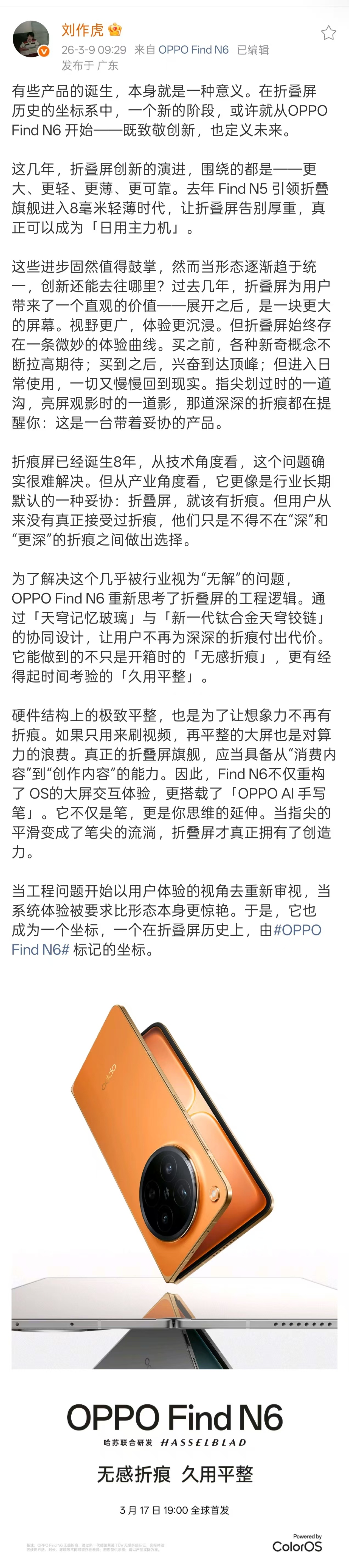 看了张老板的话,我真是感同身受我们要个折叠屏是为了干嘛呢?不就是为了用大屏打游戏、还是看剧?为了把平板塞进口袋里?买了折叠屏的问问自己你一天开展用的时间,有折叠的一半吗?怕是三分之一都没有吧问题不就在于,那道痕十分影响观感吗?但是!也就是but!在折叠屏做轻做薄做到无路可走的时候,OPPO Find N6 给行业上了一课不仅开箱无折痕,久用依旧平整!这不就是你们一直在找的折叠屏吗?另外对于这块大屏的应用,我之前多次提过OPPO要带来不一样的交互新体验让大屏可以向电脑一样的去创作,多了就不能说了,不然交罚款了只能说再加上这根AI手写笔你用OPPO Find N6展开用的时间绝对比过往的折叠都多折叠屏的新时代来了,兄弟们~ 全球最平整折叠屏OPPOFindN6