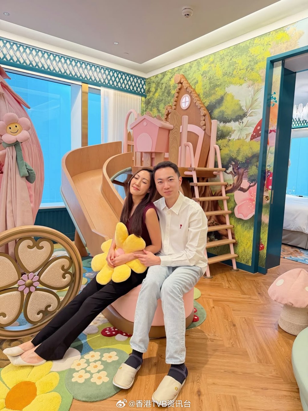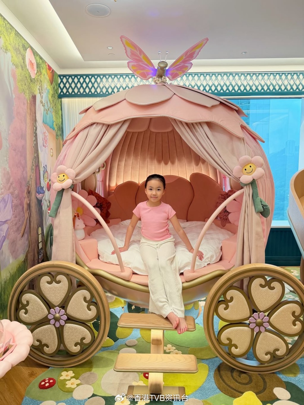 蔡雪莹拣精灵花园主题蔡雪莹日前在IG分享夫妻合照,见到二人身处的地点相当梦幻,蔡雪莹公开的酒店房间,如置身在童话故事中,房内见到有巨型粉红色南瓜车组合床,又有儿童滑梯、房间等,打造出精灵花园主题,据指这间位于港岛区五星级酒店的主题套房,一晚索价约5万元。