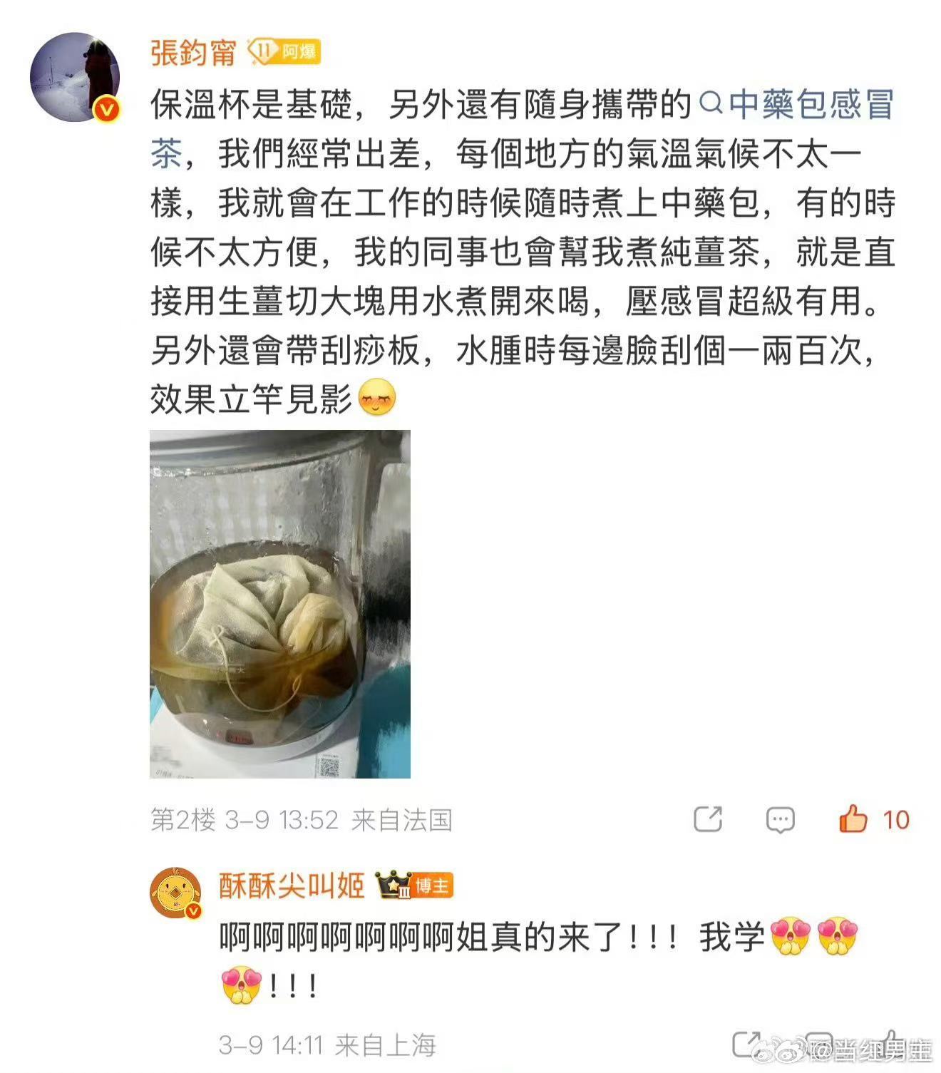 张钧甯去巴黎带了中药药包有时候工作不方便煮中药包😌张钧甯的同事还会帮她煮纯姜茶
