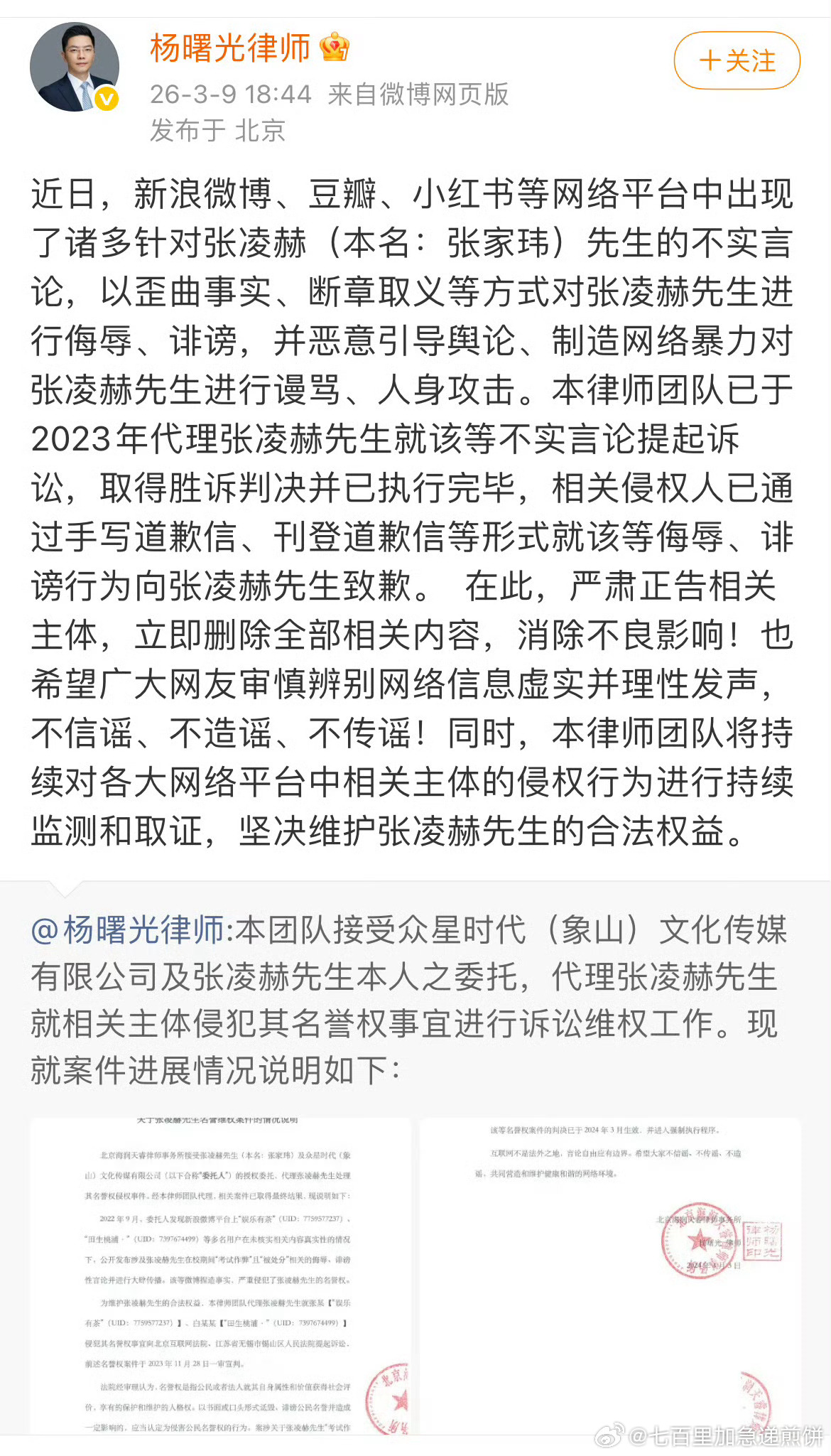 张凌赫工作室发布告黑声明