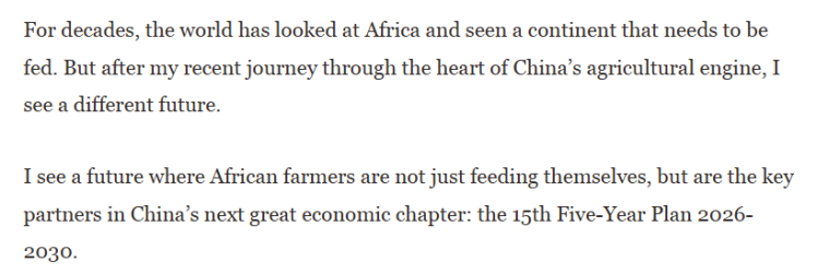 索马里新闻网站希兰在线(Hiiraanonline)发表了题为《中国“十五五”蓝图将如何惠及非洲农民》的文章。