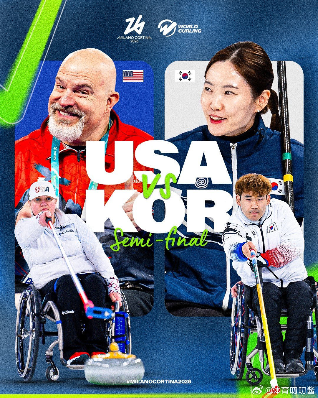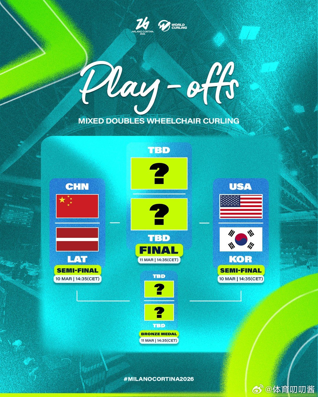 轮椅冰壶混双四强对阵:中国VS拉脱维亚、美国VS韩国,半决赛将于今日21:35打响冬残奥会轮椅冰壶混双四强出炉2026米兰冬残奥会