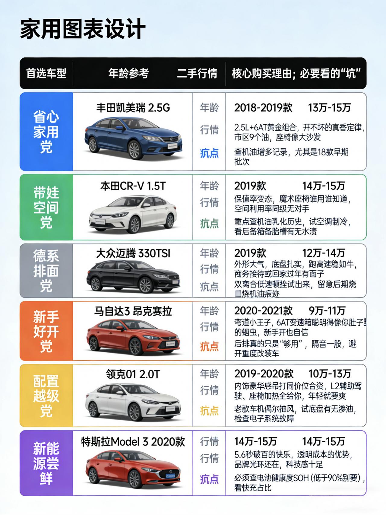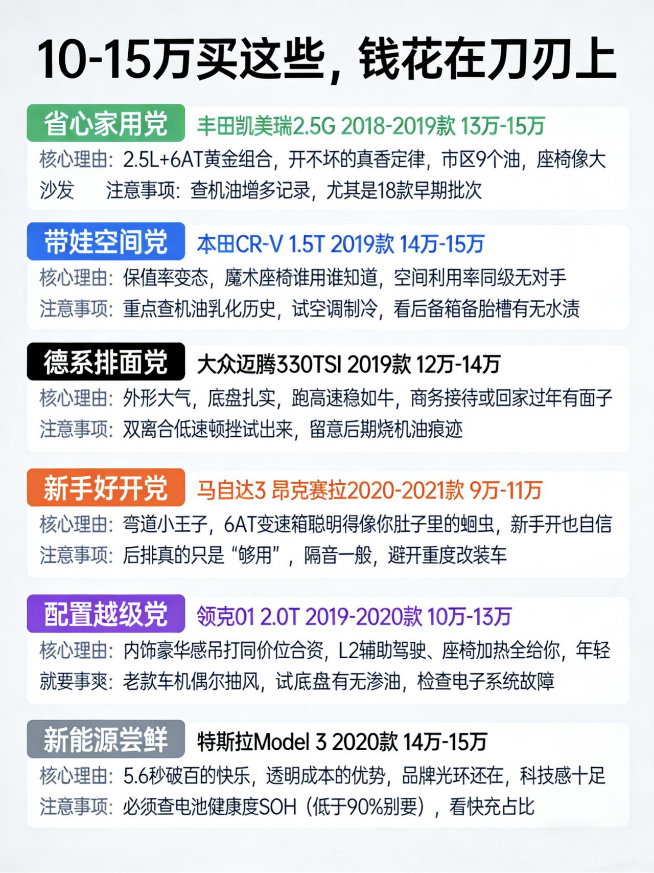 二手车选买10-15万预算,别纠结,这么买就对了! “手里攥着10到15万,想买个二手车,到底选啥?” 首先你得明白一个概念:10-15万,在二手车市场里,是“万金油”段位。 你可以用它买到当年落地20大几万的日系B级车,也可以买到正值壮年的德系“高速公路利器”,甚至可以够一够那些曾经让你流口水的“大后超”或者豪华品牌。 但问题是,怎么选?得看你回家最后那100米是怎么走的。 1️⃣如果你是“过日子型”,家里就这一辆车,图个省心、耐用、空间大 那我首推你去看看2018年左右的丰田凯美瑞,2.5L排量的那款。这代凯美瑞外观没那么老气了,但骨子里还是那个“一车传三代”的丰田。2.5L的自吸发动机配上爱信的6AT变速箱,那叫一个丝滑,开起来平顺得就像刀切黄油。你不用担心它坏,除了正常保养,它基本不会给你找事儿。油耗嘛,市区堵车也就9个多,对于这个级别来说,相当可以了。坐在里面,座椅软得像大沙发,悬挂也舒服,过个减速带“咚咚”两下就过去了,没啥余震。这就是典型的“工具车”,它不会让你兴奋,但绝对能让你踏实。 2️⃣如果你家里添了娃,或者经常带着父母孩子出门,那空间就是刚需 这时候,我建议你重点关注一下2019年左右的本田CR-V,1.5T的那个版本。为啥是它?因为本田号称“空间魔术师”,这话真不是吹的。它的后排地板几乎是纯平的,坐三个人中间那个人也不难受。后备箱更是巨大,而且开口很低,你搬个婴儿车、或者周末去山姆扫货,往上提重物的时候,就知道这个低开口有多香了。而且它的保值率高得吓人,你现在买回来开两年,再卖出去也亏不了多少钱,相当于“白嫖”用车。但买它的时候留个心眼,一定要查清楚之前有没有“机油增多”那批次的隐患,虽然厂家后来召回了,但咱得心里有数。 3️⃣如果你经常跑高速,或者偶尔要接送个客户,想要点“排面” 那2019款的330TSI迈腾,绝对是你的菜。大众的车,尤其是迈腾,跑高速那种“贴地飞行”的稳重感,同级别里真的是数一数二。你一脚油门下去,2.0T的发动机动力随叫随到,超车干净利落,底盘扎实得就像长在路面上一样。外观呢,又大气又商务,开回老家过年,村里人绝对认这车,觉得你在外面混得不错。不过,德系车的老毛病你也得提前有心理准备——双离合变速箱在堵车的时候,一二档来回切,会有点轻微的“闯动感”,你得去试驾一下,看看自己能不能接受这种性格。 4️⃣如果你是刚拿驾照的新手,或者就喜欢开车的那种“人车合一”的感觉 那我墙裂推荐你去试试2020年左右的马自达3 昂克赛拉。马自达这牌子,是出了名的“倔驴”,大家都加长后排,它偏不;大家都搞涡轮增压,它还在死磕自然吸气。但就是这份倔强,让它变得特别好开。它的6AT变速箱,聪明得就像知道你心里在想什么。你想加速,它瞬间降挡,转速拉高,发动机传来zoom-zoom的声浪,那种跟车交流的感觉,特别上头。方向盘指向精准,过弯的时候车尾跟随性特别好,新手开它,能很快建立起驾驶信心。当然,它的缺点也很明显:后排空间真的只算“够用”,隔音也一般,高速上风噪胎噪有点大。但如果你大部分时间是自己开,或者就俩人,那它的快乐,绝对能覆盖掉这些小毛病。 5️⃣如果是年轻人想买智能车,2019-2020款领克01 2.0T值得看。 它内饰翻毛皮+软质材料,质感越级;L2辅助驾驶、座椅通风加热等高配拉满,科技感强。搭载沃尔沃同源动力,安全性能靠谱。但老款车机系统偶尔会卡顿或死机,得像包容电子产品一样包容它的小脾气。 6️⃣如果你家里有充电桩,2020年前后的特斯拉Model 3你看看。 5.6秒的百公里加速,这是什么概念?就是你在红绿灯起步,一脚电门下去,后面的车只能看你的尾灯。而且电车的用车成本是真的低,一公里几分钱,开得越多省得越多。操控也是它的强项,重心低,转向精准,开起来就像个大玩具。但买二手电车,有个绝对不能省的步骤——查电池健康度。一定要找第三方或者去官方查,看看电池的SOH(寿命状态)还有多少,如果低于90%,价格再便宜也尽量别碰,因为换电池的钱可能比车还贵。 👉最后这掏心窝子给你说几句: 1. 别为面子买单:同价位虽能买二手BBA(如奥迪A4L、宝马3系),但其维修保成本仍按30万级标准计算,后续修车费用可能掏空钱包。 2.公里数≠车况:相比里程,5年左右的车更看重保养记录。全程4S店保养的高里程车,往往比从未进店的低里程“僵尸车”更靠谱。 3.试驾要“狠”:别只在平路开。上减速带听底盘异响,冷启动听发动机杂音,试自动启停的抖动。二手车一车一况,自己的屁股和耳朵才是最准的检测仪。 总而言之,10到15万这个预算,在二手车世界里,你完全有资格“挑三拣四”。你不用向新车市场妥协,你可以根据自己的真实生活,去选那个最对脾气的伙伴。【来自懂车帝车友圈】