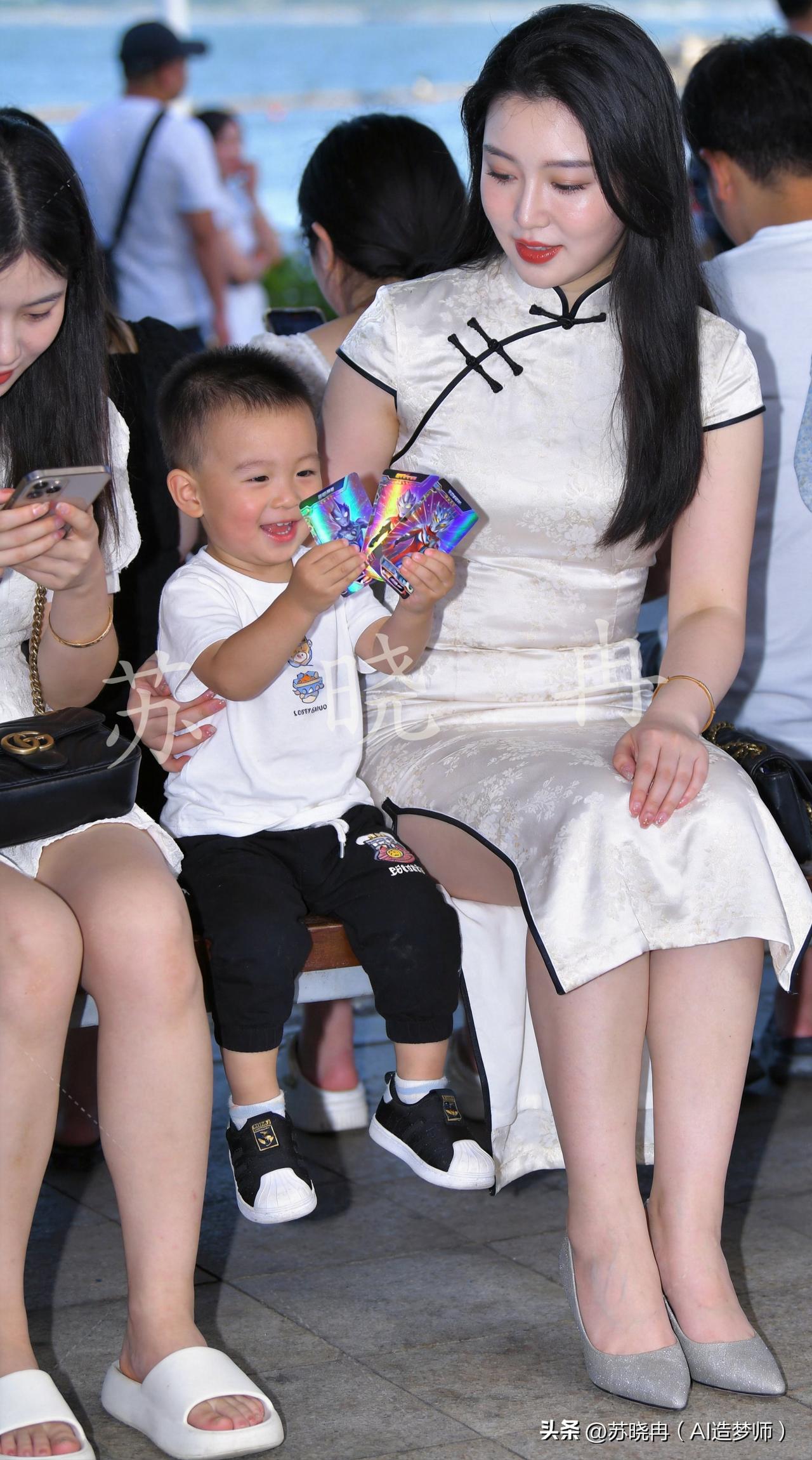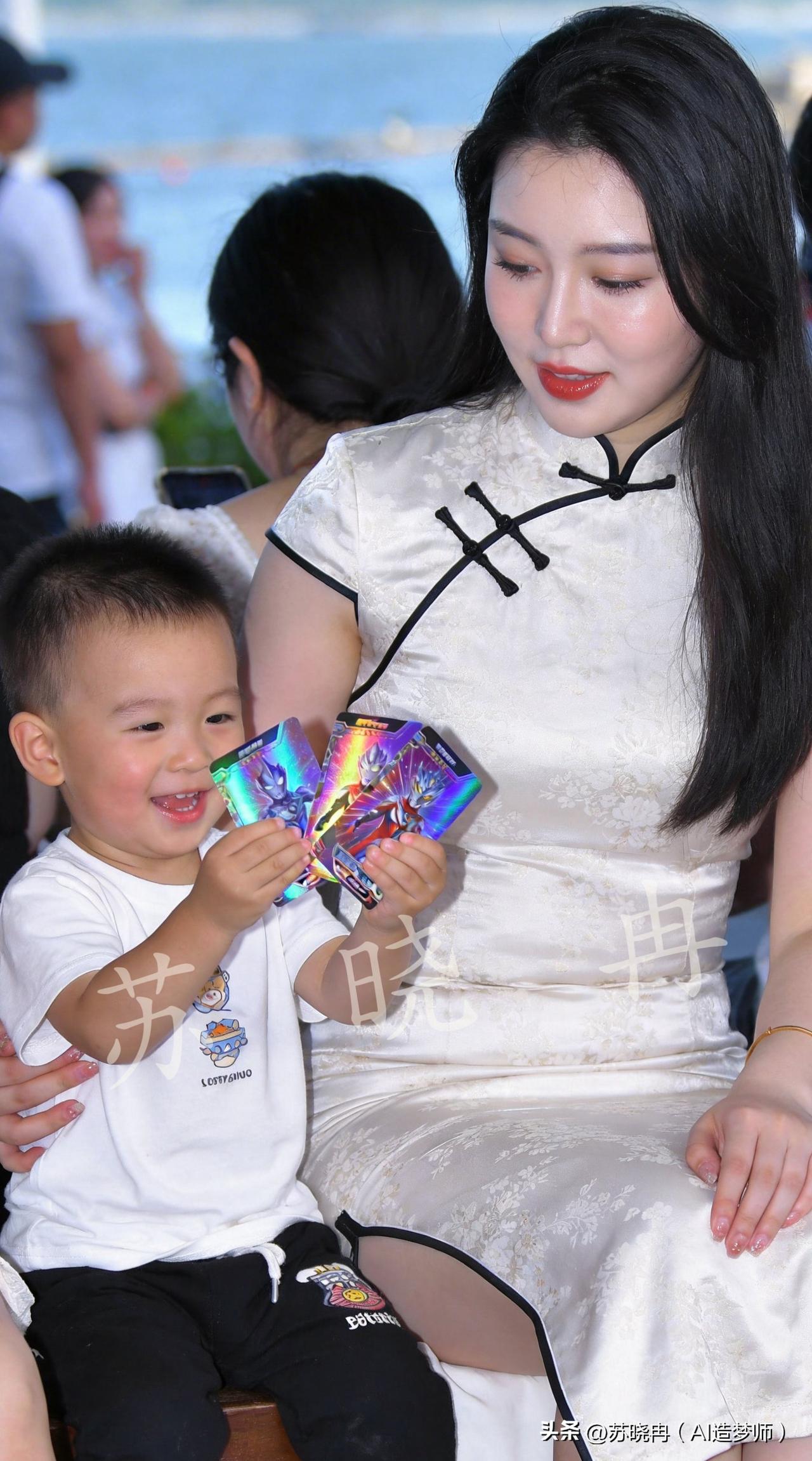 海边遛娃日常:娃沉迷奥特曼卡牌,妈妈一脸茫然,小姨专心刷手机🤣 海风裹着咸甜的气息,远山与碧海在身后铺成温柔的背景。妈妈穿着素雅的旗袍,轻轻环抱着一旁的小家伙,耐心听他分享藏在手心的宝贝—— 他举着三张闪着镭射光的卡牌,眼睛亮得像藏了星星:“妈妈你看!这是迪迦奥特曼,这是我最爱的赛罗奥特曼,还有他的徒弟泽塔奥特曼!” 小家伙的声音脆生生的,完全沉醉在自己的奥特曼世界里,连指尖都透着雀跃。妈妈低头看着这些陌生又酷炫的身影,带着几分温柔的茫然,却还是笑着点头应和;一旁的小姨则低头刷着手机,指尖在屏幕上轻点,和这对母子的温馨画面,拼成了海边最松弛的日常。亲子的美好时光 遛娃 写真人像摄影