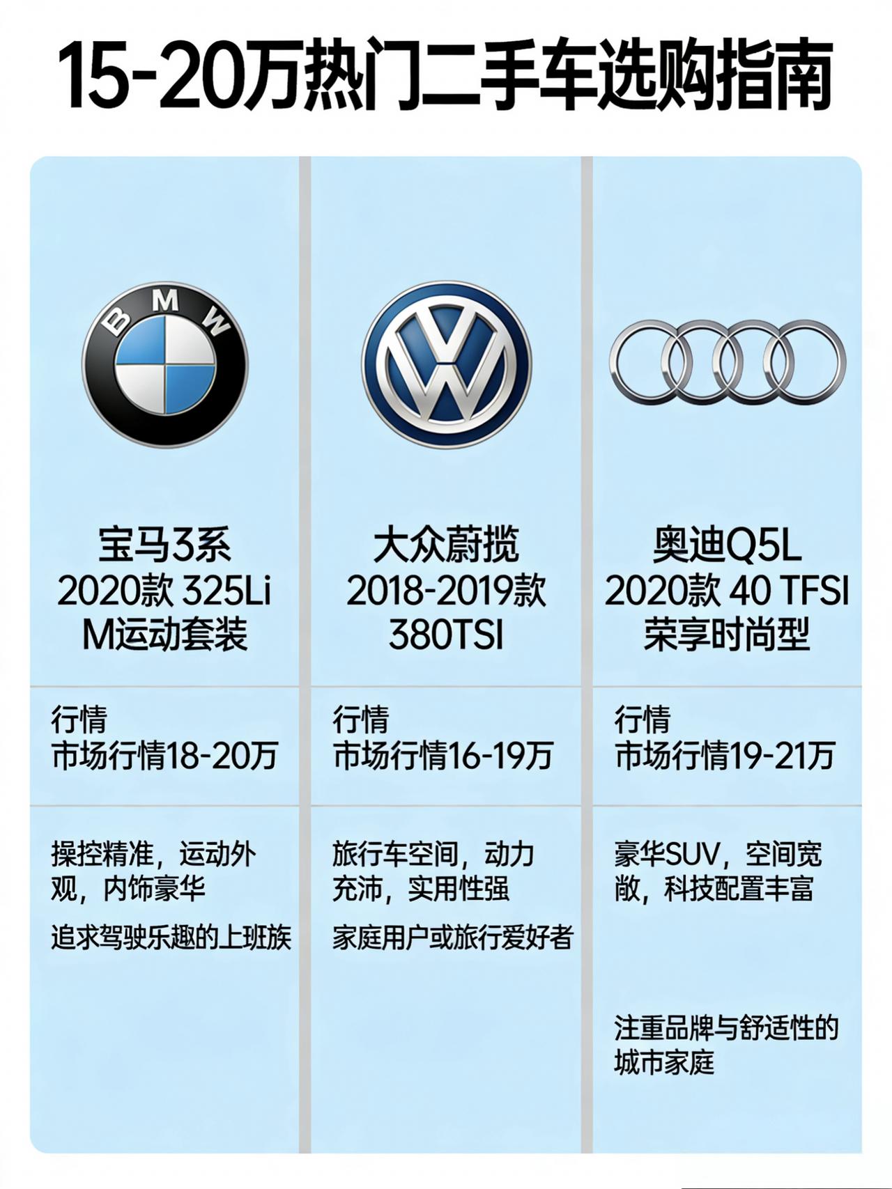 咱们聊聊15-20万区间里热度高、值得看的3款二手车。都是市面上流通量大、口碑稳的车型,你看完心里大概有个数。 一、德系豪华轿车:宝马3系 2020款 325Li M运动套装 现在啥行情? 2020年左右上牌、里程5-6万公里的325Li,目前市场价在14-16万之间。车况好的能摸到17万,但15万左右是主流成交区间。 这车啥来头? G系列的宝马3系,是现款在售的那一代。B48发动机配采埃孚8AT,这套动力组合被很多人称为"黄金搭档"。184匹马力,后驱,开起来那种人车合一的感觉,同级别里确实难找对手。 M运动套装加持,外观看着挺精神,熏黑轮毂、运动包围,年轻人开出去不丢面儿。内饰虽然不如奔驰精致,但该有的都有,鸡腿挡把还是那个味儿。 个人观点: 这个价格买3系,其实是捡了个便宜。当年新车落地35万左右,现在三年车龄直接腰斩。关键是这代3系舒适性提升了不少,后排空间也够用,兼顾了家用和驾驶乐趣。 但有个坑你得躲开:一定要查气门室盖有没有渗油。2020款部分车型有这个通病,换改进件要两三千块。看车的时候打开机盖仔细瞅瞅,有渗油痕迹可以作为砍价筹码。另外最好找保养记录完整的,那种几万公里没换过机油的别碰。 适合谁? 年轻人想要驾驶乐趣,又得兼顾家用的;或者想体验"开宝马"什么感觉的。 二、进口格调之选:大众蔚揽 2018-2019款 380TSI 现在啥行情? 2018-2019年上牌的蔚揽380TSI,里程6-8万公里,目前行情在12-15万之间。车况极品的能到16万,但主流成交价在13-14万左右。 这车啥来头? 进口大众,原装德国制造。2.0T高功率发动机,220匹马力,配6速湿式双离合。旅行车造型,后备箱巨大,后排座椅放倒能当床用。 很多人不认识这车,以为是普通大众。懂行的才知道,这是进口货,用料、做工、底盘质感都比国产迈腾强一截。而且旅行车在国内算小众,开出去不撞衫。 个人观点: 这车适合那种"不想随大流"的人。同样的钱买迈腾,满大街都是;买蔚揽,邻居得问你"这是啥车,挺好看"。 最关键的是进口车的品控确实稳。有车主反馈开了8万公里,除了正常保养啥毛病没有。油耗也还行,综合8个油左右。 但有个问题你得想清楚:旅行车在国内保值率一般,买的时候便宜,卖的时候也别指望能多卖钱。另外配件比国产大众贵一点,但比BBA便宜多了。 适合谁? 喜欢自驾游的,经常带家人出门的,或者就想买个不一样的车的人。 三、豪华品牌SUV:奥迪Q5L 2020款 40 TFSI 荣享时尚型 现在啥行情? 2020年左右上牌、里程6-8万公里的Q5L,目前市场价在17-19万之间。车况好、配置高的能到20万出头,但主流成交价在18万左右。 这车啥来头? 奥迪的销量担当,中型SUV里的常青树。2.0T发动机190匹马力,配7速双离合,带quattro四驱。轴距加长之后,后排空间相当宽敞,家用完全够用。 这代Q5L的外观挺耐看,既不张扬也不老气。内饰虽然还是上一代的设计,但做工用料都在线,该软的地方软,该有质感的地方有质感。 个人观点: 18万买台奥迪中型SUV,说实话挺值的。当年新车落地40万左右,现在直接打对折。关键是Q5L这车没啥大毛病,EA888三代发动机已经优化得很稳了,烧机油的问题基本解决。 开出去有面儿,用起来省心,保值率在豪华SUV里也算可以的。而且奥迪的维修保养比奔驰宝马便宜,找个靠谱修理厂,小保养几百块搞定。 但有个坑你得注意:双离合变速箱低速顿挫的问题还存在,试驾的时候多感受感受。另外检查颗粒捕捉器,2020款部分车型有过堵塞的案例。 适合谁? 想要豪华品牌SUV撑面子,又不想太折腾的人;或者家里有娃需要大空间,但不想开MPV的。 几句实在话 这三款车,代表三种不同口味: 14-16万:宝马3系 2020款 325Li,驾驶乐趣在线,面子也有 12-15万:大众蔚揽 2018-2019款,小众有格调,空间实用 17-19万:奥迪Q5L 2020款,豪华品牌SUV,家用体面 最后提醒一句:二手车是一车一况一价,我给的只是行情参考。具体到某台车,一定花几百块钱找个第三方检测,把车况查得明明白白再掏钱。【来自懂车帝车友圈】
