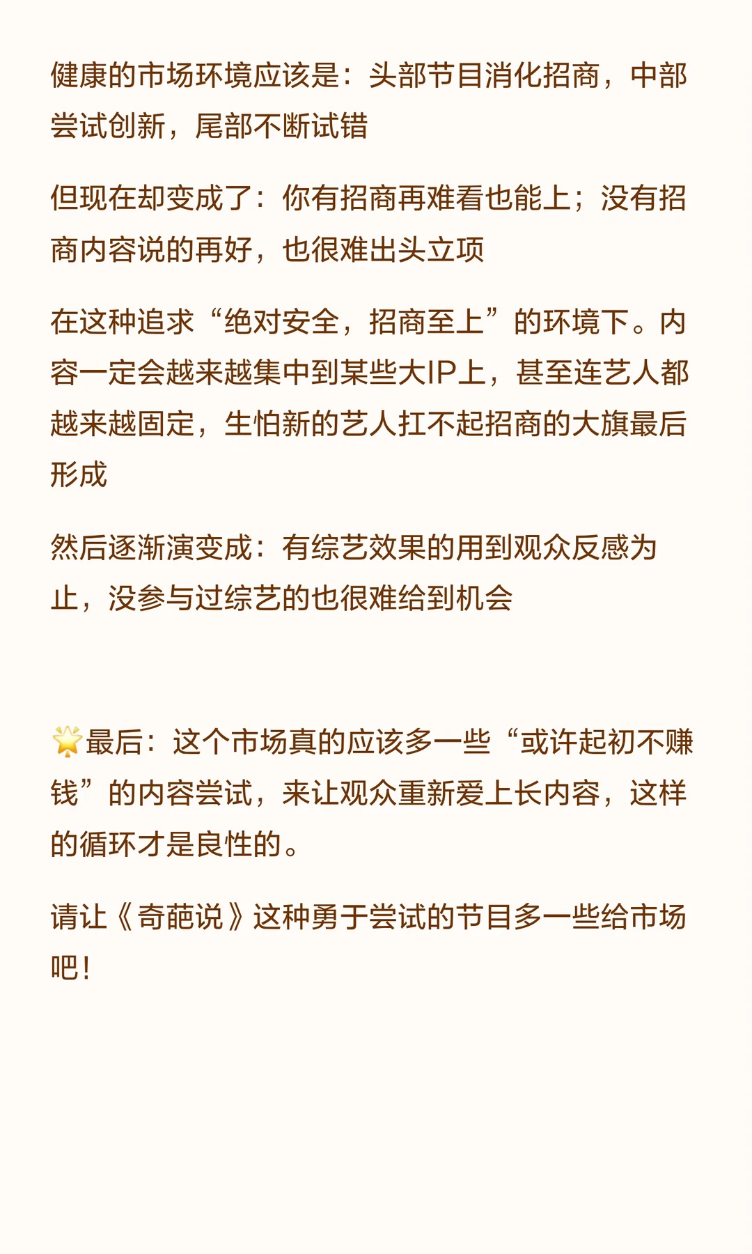 这个市场真的应该多一些“或许起初不赚钱”的内容尝试 来让观众重新爱上长内容,这样的循环才是良性的 请让《奇葩说》这种勇于尝试的节目再多一些吧!
