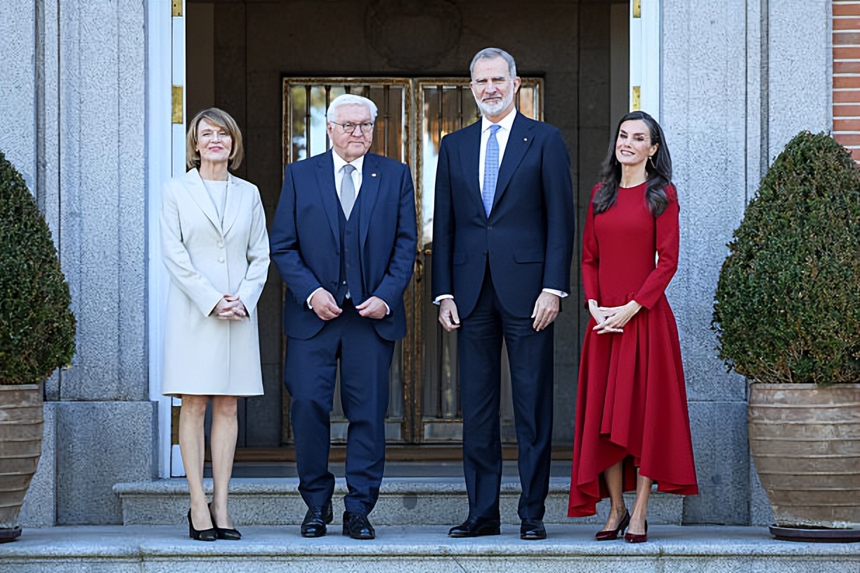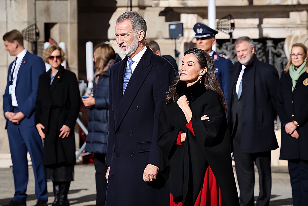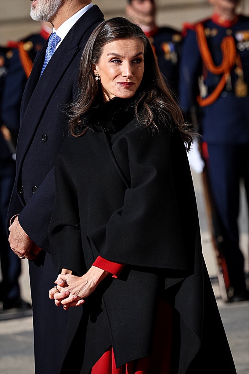 西班牙王后欢迎德国总统太美艳了!红裙配斗篷太好看,光腿真抗冻