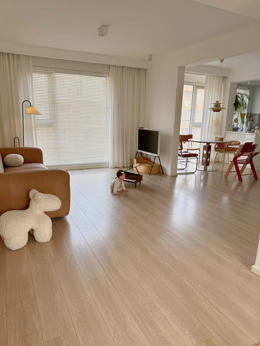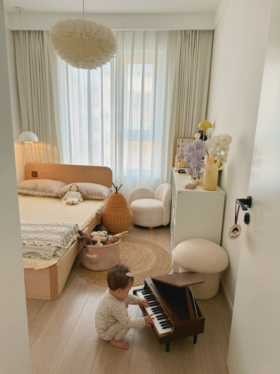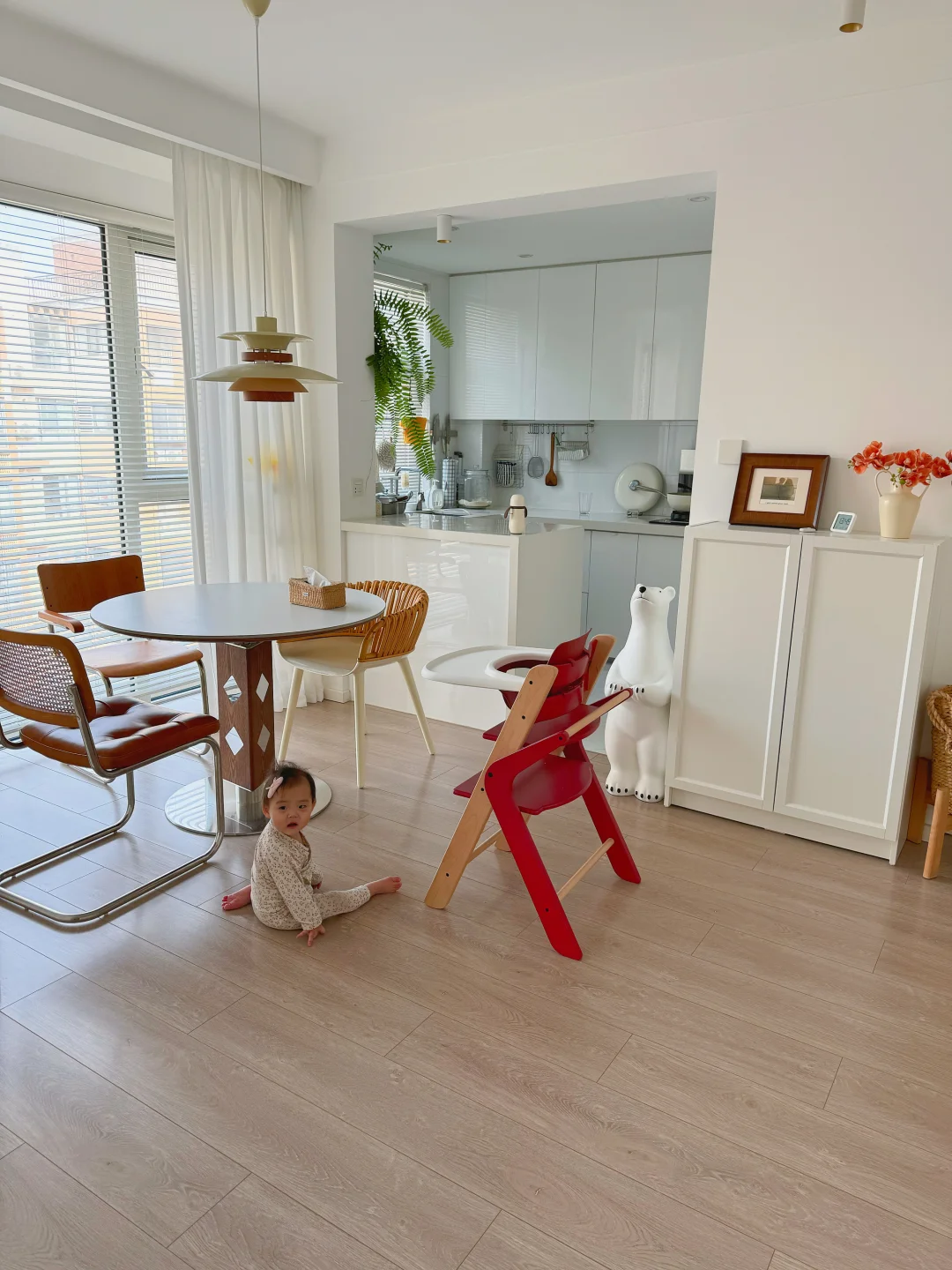 36岁,俩娃,一房 把家一点点打造成理想中的模样 没有其他家里的满当当,豪华 有的是家里俩娃的幸福感 - 打通餐厨区让动线更流畅,客厅干净明亮,开放式厨房里藏着满满的烟火气。 看着妹妹自己在那玩姐姐拿压岁钱🧧送的小钢琴🎹,越看越幸福