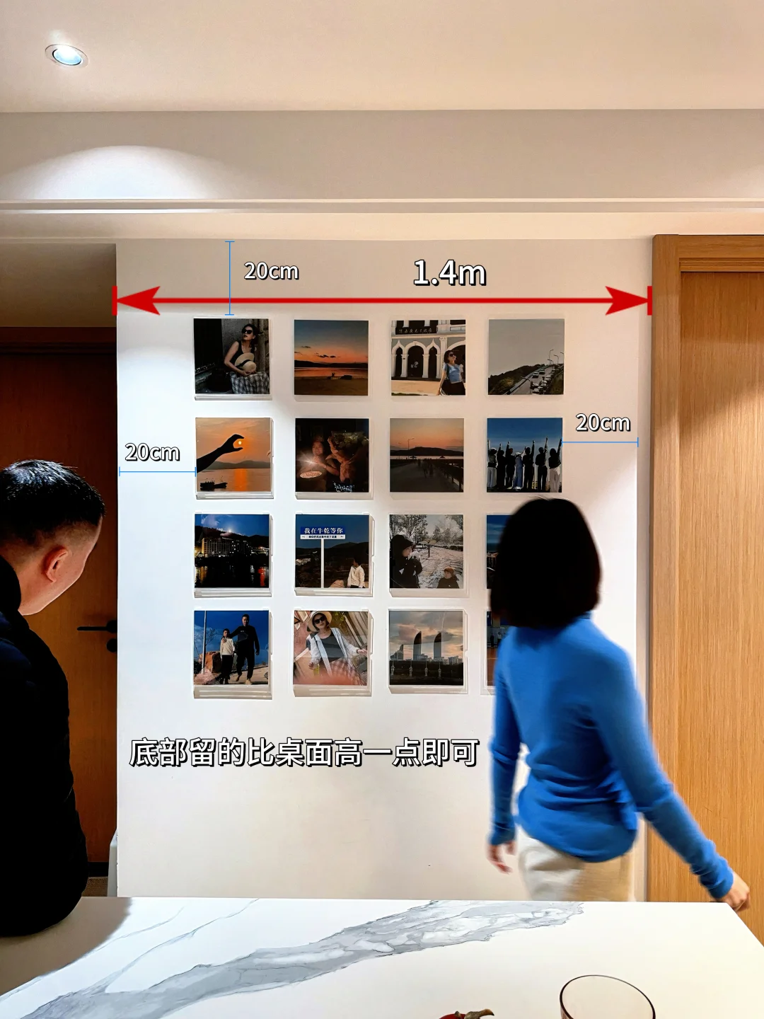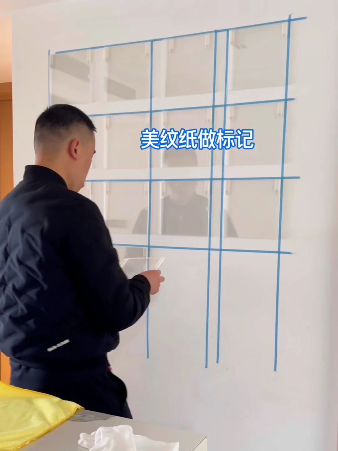 我家这面墙1.4m宽,两个相框之间间隔5cm,左右上各留20cm空白。如果墙壁特别宽的,也可以考虑6~8cm。先用美纹纸框出总框架,再对齐贴平