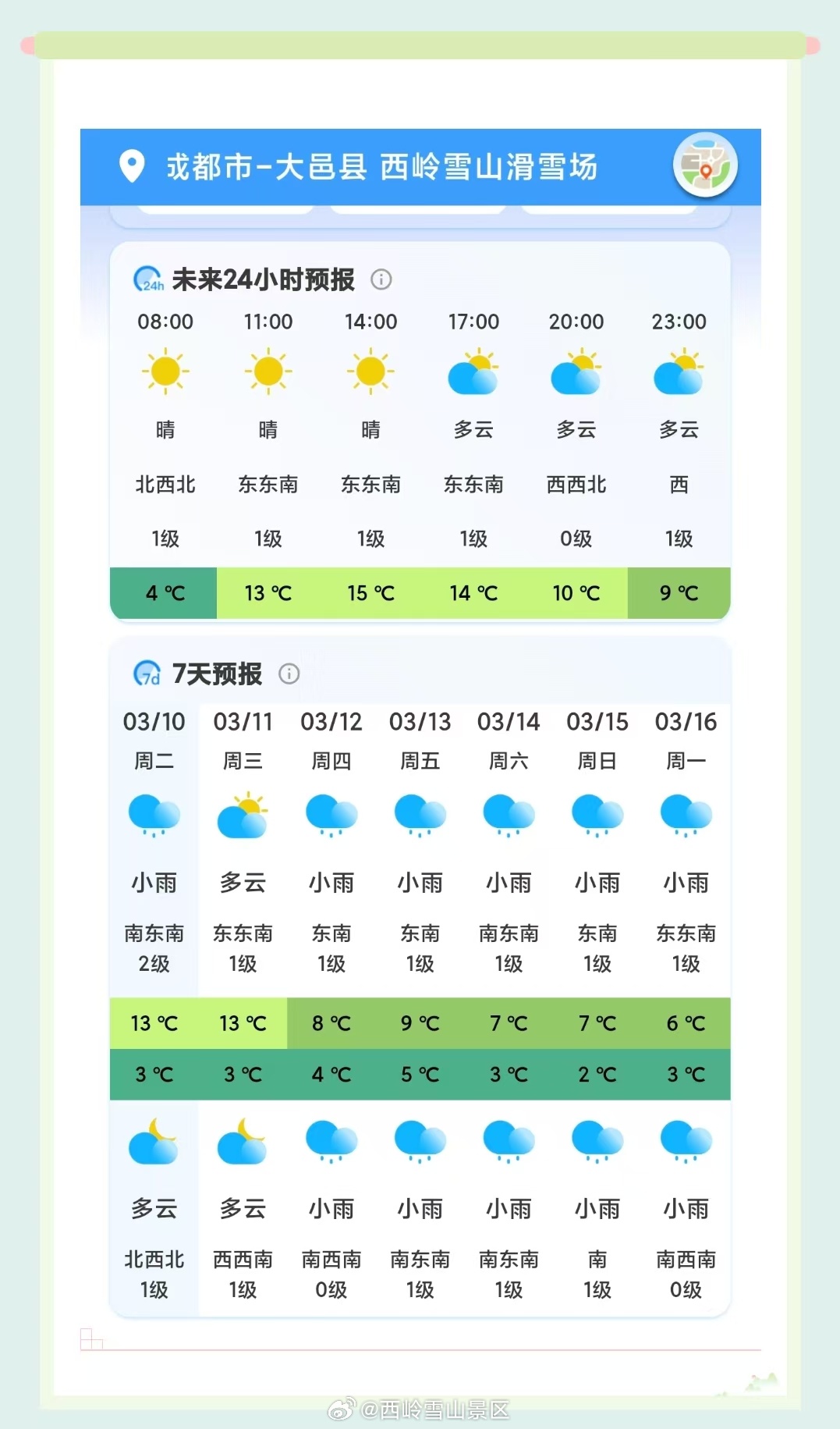 西岭雪山3月11日(周三)气象预报#西岭雪山#