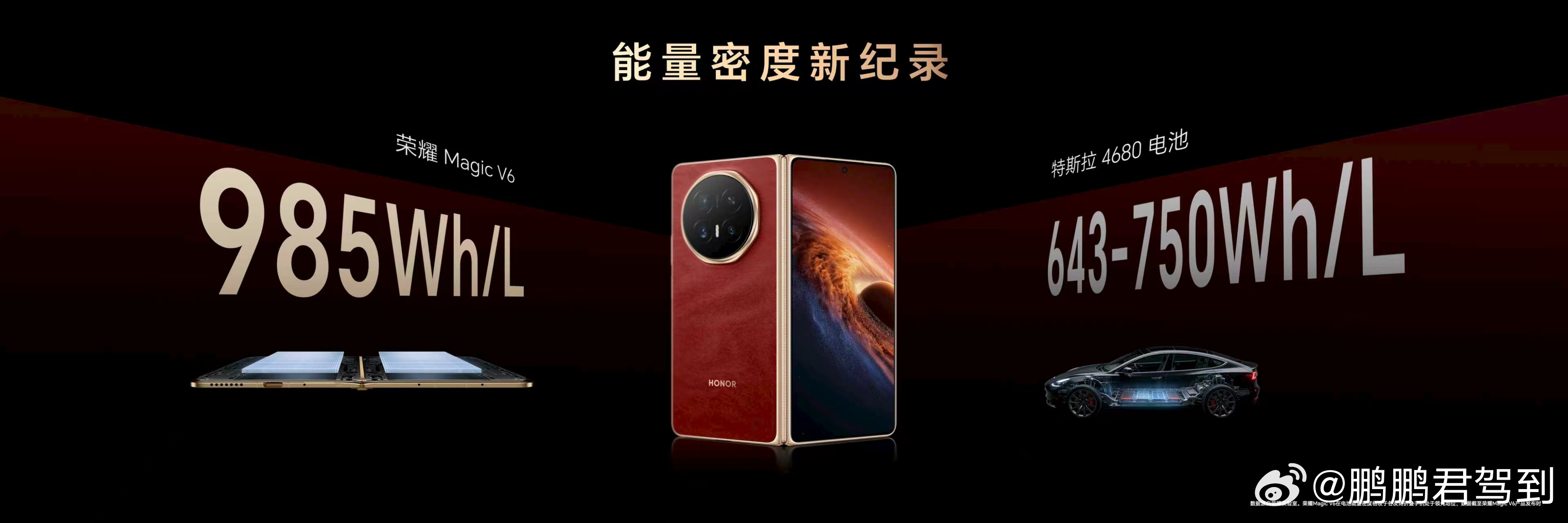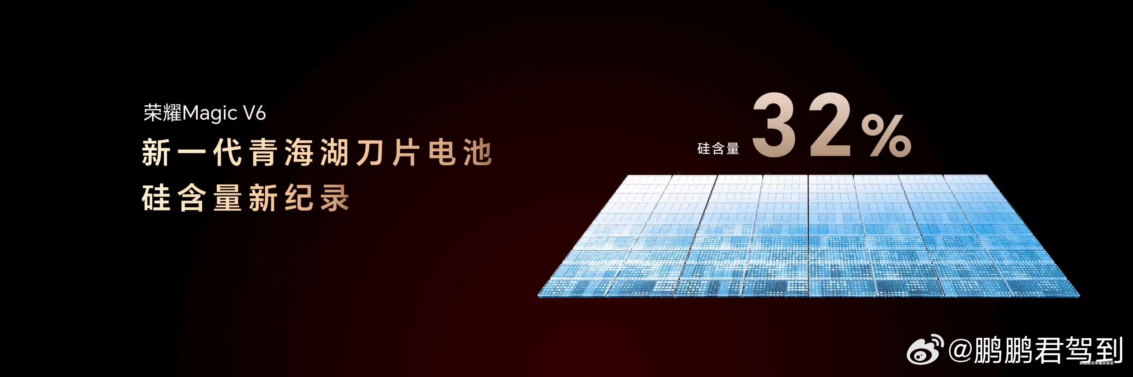 荣耀Magic V6 所搭载的新一代青海湖刀片电池,电池容量来到了7150mAh,硅含量高达32%,是行业均值的2倍,能量密度达到985Wh/L,荣耀MagicV6电池领先行业两代 。第五代高硅青海湖电池的电池容量也高至6850mAh,硅含量为25%,依旧是目前折叠机行业的追赶标准。