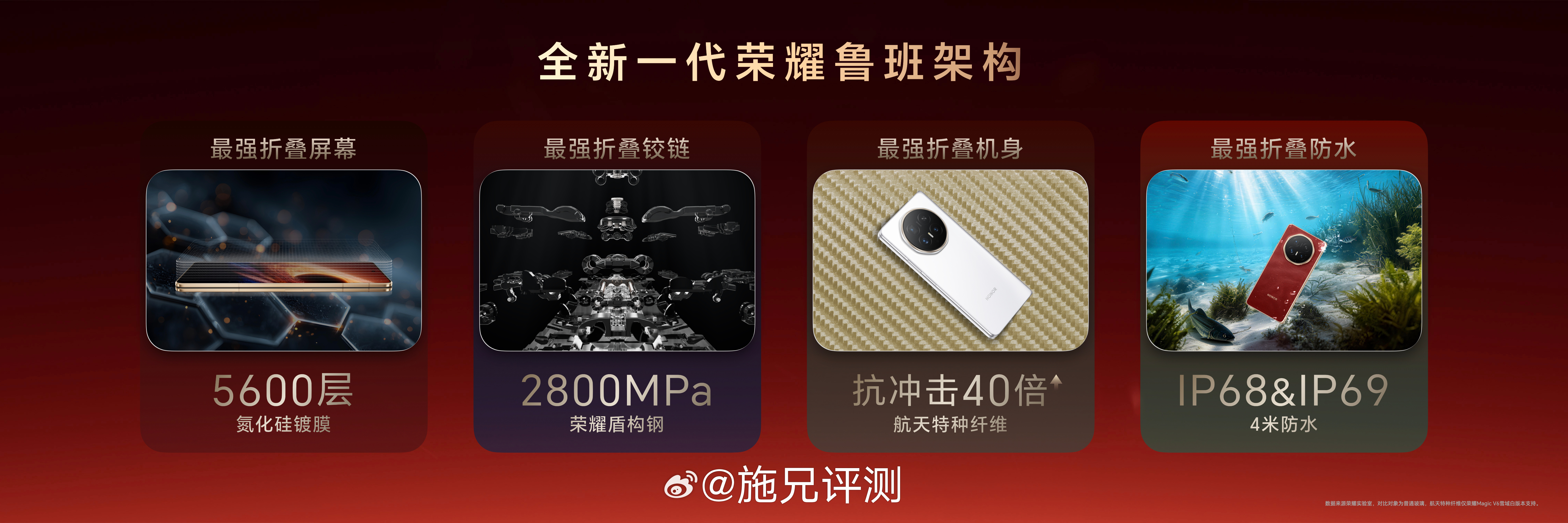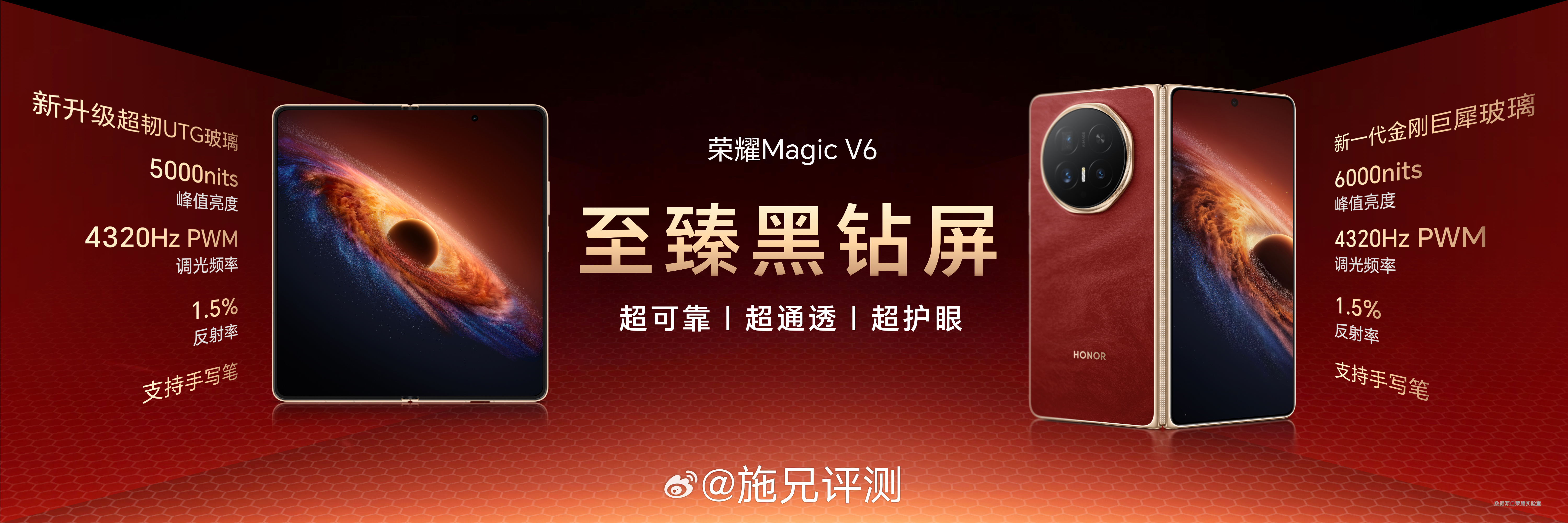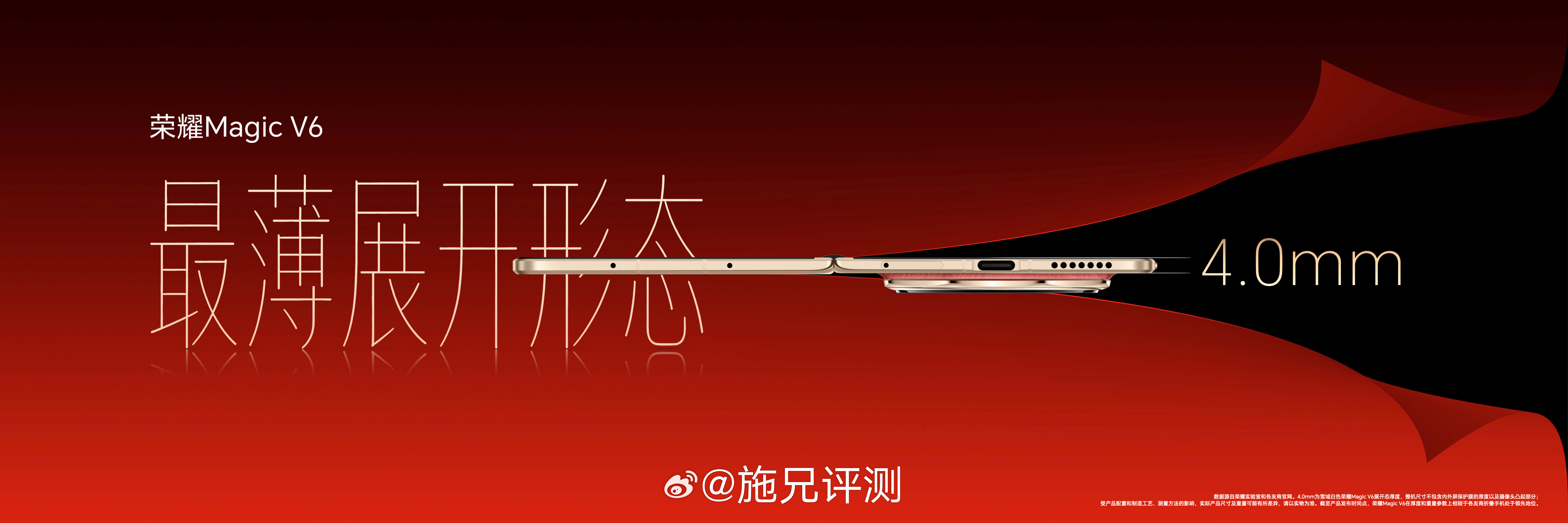折叠形态下薄至8.75毫米,轻至219g,展开状态下的厚度只有4.0毫米,荣耀MagicV6最轻薄折叠屏 实至名归。外观设计上在荣耀Magic V系列高颜值的基础上全新设计,在配色、边框、镜头模组设计上满满匠心,将顶奢材质与高端质感完美融合,获2026年iF设计奖。主打的赤兔红配色更兼美好寓意,屏实力马上红。 荣耀Magic V6折叠大满贯荣耀Magic V6首发评测荣耀Magic V6