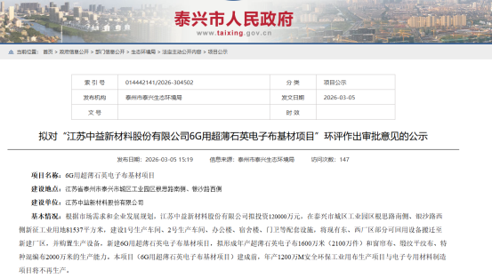 上证报中国证券网讯(林玉莲记者曾庆怡)记者自泰州市人民政府官方网站获悉,近日,江苏中益新材料股份有限公司(以下简称“中益新材”)6G用超薄石英电子布基材项目已经步入环评受理公示阶段。