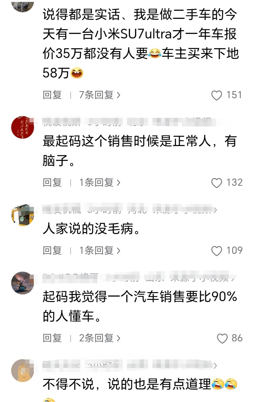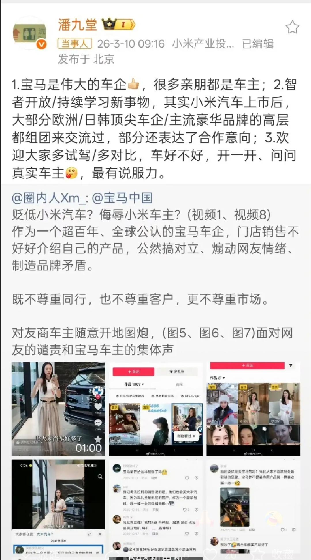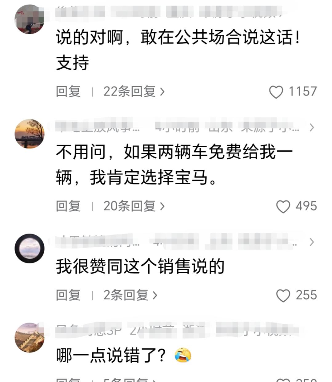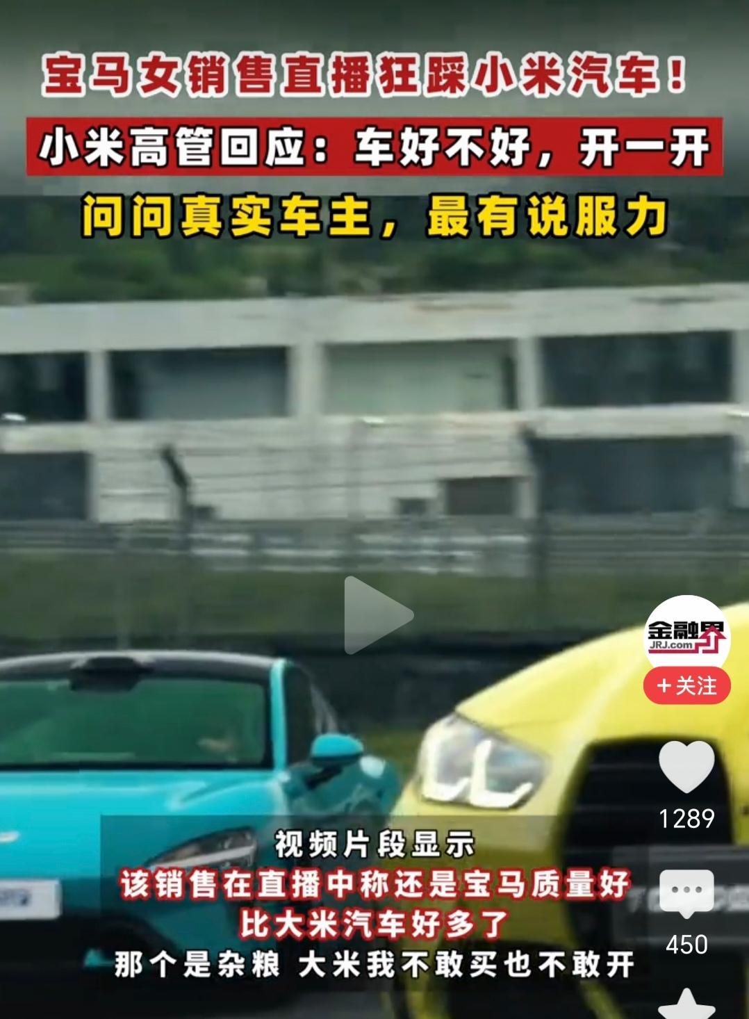 “180天的速成鸡可以吃,180天造的车我可不敢开,还是宝马车质量好,比大米汽车强多了”,这是宝马一位女销售在直播时说的一番话,没想到直接在网上炸锅了。 女销售说的大米汽车,估计网友们都能想的到,她说的其实就是小米。 3月10日,上海一家宝马4s店女销售在直播时做讲解,把小米汽车暗讽为180天的“速成鸡”,并且表示这样的汽车她不会买来使用。 宝马汽车作为豪华德系车,它的产品力和质量是毋庸置疑的,但是在直播间里贬低其他品牌,特别是网红国货小米,瞬间引起了网友们热议。 “这个女主播要火了,估计要被网暴”,这是很多网友的直觉。 毕竟小米汽车曾经多次因为事故原因上热搜,一出现负面消息,最先出来解决的就是法务部,很多人都赔了官司,大家对小米都不敢说话了。 谁也没有想到,区区一个宝马汽车的销售居然在直播时说出那样的话:“180天的速成鸡可以吃,但180天造的车我是真不敢开,还是宝马质量好,比大米汽车好多了!” 对于这件事,小米产业投资部合伙人潘九堂转发该微博表示,宝马是伟大的车企,但是小米也不是一无是处,他表示:车好不好,开一开、问问真实车主,最有说服力。 小米汽车一上市就非常火爆,出现了非常多的话题,特别是雷军说过的充一次电能跑1300公里,甚至是转向时指示灯变亮等等言论,现在都成了笑话了。 小米汽车到底好不好呢?和很多网红产品一样,刚开始出来时非常多的人热捧,火热劲过去了,现在都没大有消息了。 对于这位女销售的言论,有很多人觉得她贬低国产品牌,会被网友们唾骂和被小米汽车法务部追究法律责任。 但是看到小米高管的反应,还有网友们的回复以后,我们才知道,大家心里都有一杆秤,“黑的就是黑的,白的就是白的,说的天花乱坠没有用!” 网友们的回答很一致:“人家说的没毛病!” 大家觉得她说的对不对呢?欢迎评论区留言[祈祷]