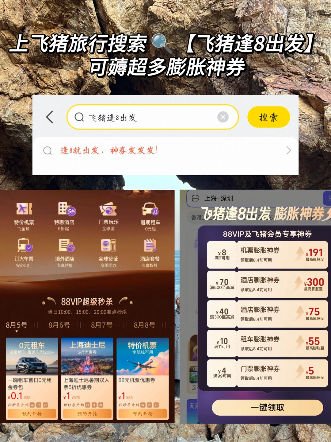 订酒店先别急,来薅一波羊毛。暑期飞猪推出了88vip权益活动🌸,88VIP或飞猪f4及以上会员可以上淘宝/飞猪搜【飞猪逢8出发】,或者点击左下角按钮进入主会场领取专属88VIP/飞猪f4及以上会员的旅行福利 ,有许多的大额酒店膨胀神券,用上它订酒店可以帮我们抵扣很多费用💰