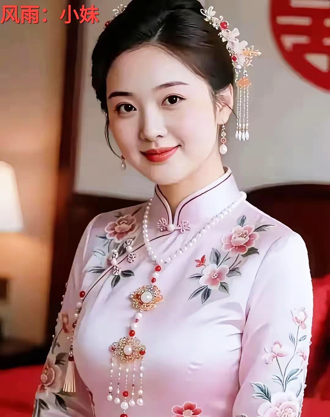 优雅红衣女子,粉花映衬下的古典之美