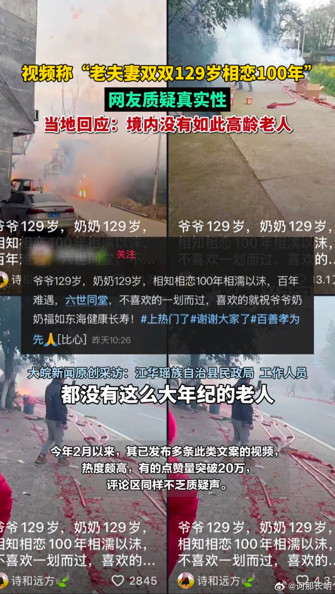老夫妻双双129岁相恋100年引质疑官方已辟谣,内容全是假的3月9日,湖南永州一博主发视频:爷爷奶奶均129岁、相恋100年、六世同堂,配喜庆画面但全程无老人出镜。账号自称“湖南省乡村振兴营销推荐官”,粉丝39.3万,此前多次发虚假长寿内容。3月10日,江华瑶族自治县民政局辟谣:当地最高寿仅一百零几岁,无129岁老人记录。永州市委核实:“推荐官”身份系伪造 。这是一起伪造身份+编造长寿爱情故事的流量骗局,已被官方实锤虚假 。老夫妻双双129岁相恋100年引质疑
