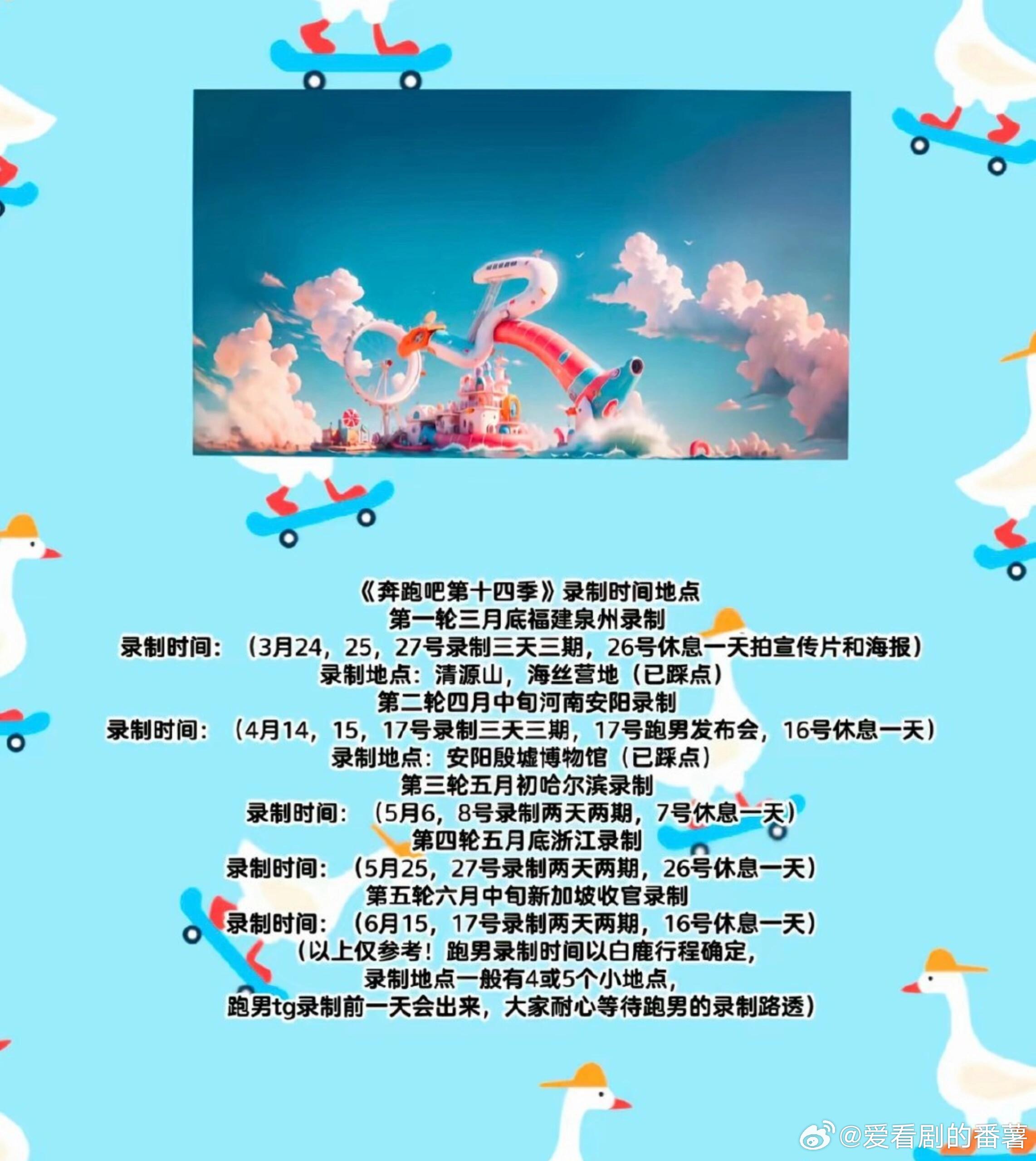 奔跑吧十四季来了第十四季 首次录制时间:3月25日~3月29日常驻:李晨 郑恺 沙溢 白鹿 周深范丞丞 宋雨琦 张真源奔跑挚友:孟子义 李昀锐新一季录制地点:海南省海口市目前网传的录制计划:五天录制三期 26日和28日休息 26日录制宣传片➕拍摄主海报(目前网传录制计划为假 一切录制计划等后续更新发布)具体要等官方