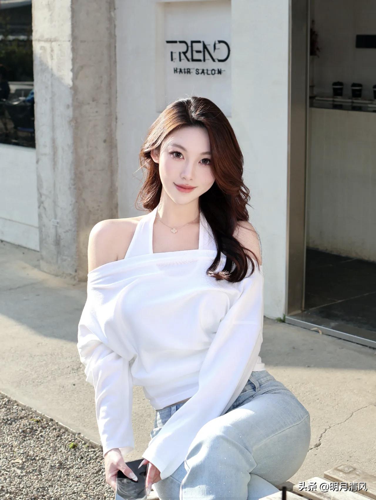 在街边喝杯东西,有时候随便一站就挺出片。今天拍了一组照片,姑娘穿着白色露肩上衣配浅蓝牛仔裤,阳光刚好从侧面打下来,头发边缘都透着光。 最戳我的是第四张——她侧身对着镜头,贴着窗边站着,身体朝前,脸却从侧后方回过来看镜头。这个角度挺妙的,不是直愣愣的正脸,也不是完全背对,就是那种不经意回头的感觉。阳光扫在脸上和肩膀上,发丝被风吹得有点乱,但反而更自然。 评论里都在问:这种回头到底怎么转才不会僵硬?有人说是眼神要软一点,有人说是身体要松。你觉得呢,这种侧身回头的pose,是摆拍还是抓拍更有味道?