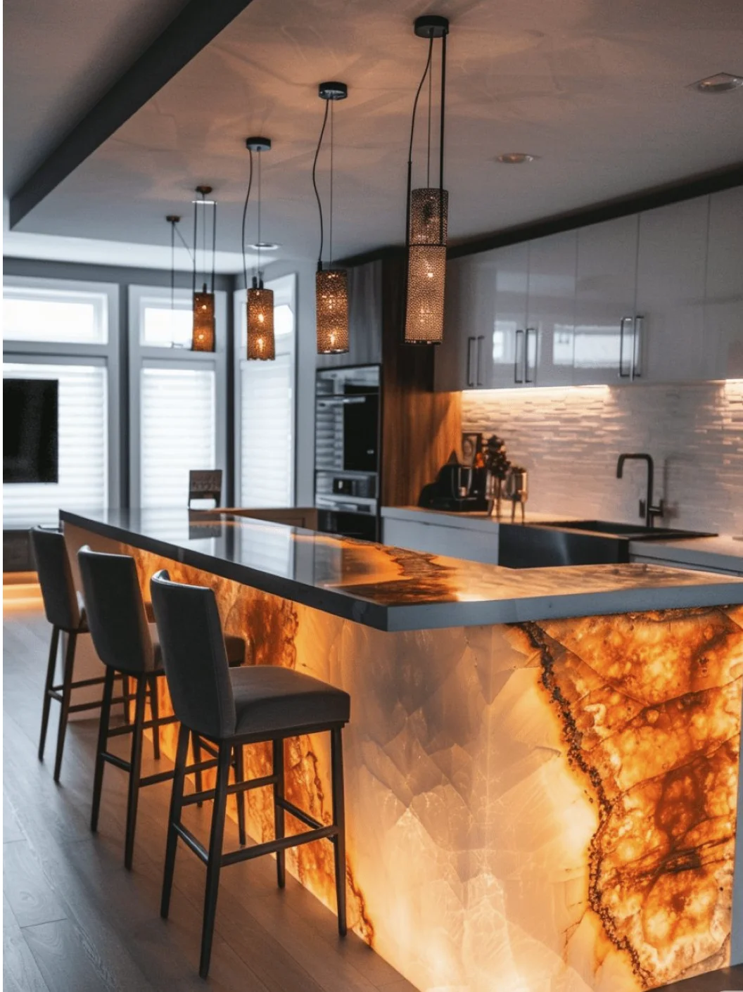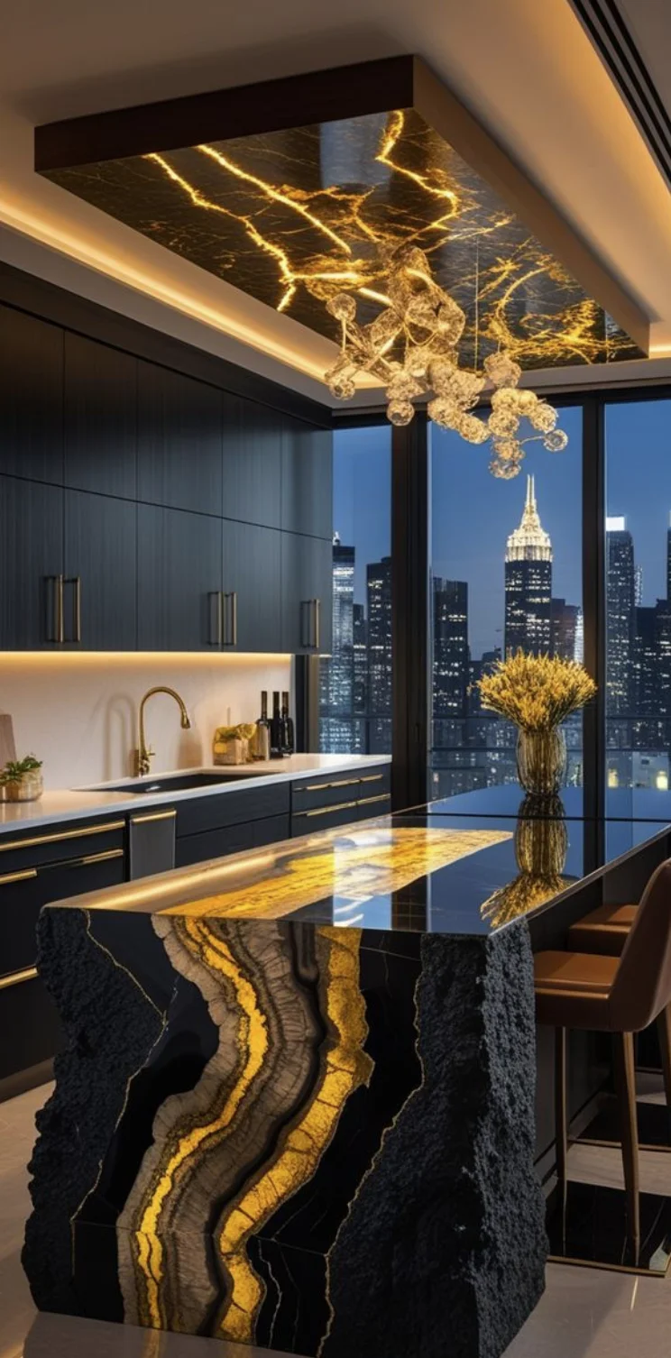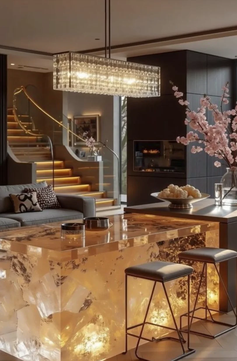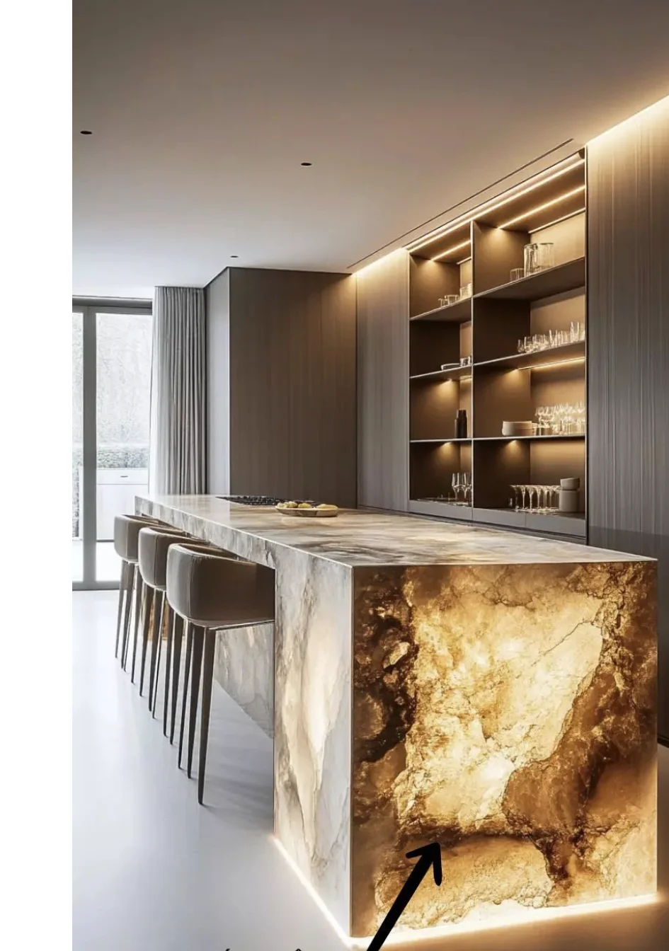 - 透光玉石/玛瑙:内部嵌入灯带,让纹理在光影中流动,像把流动的星河封进台面。