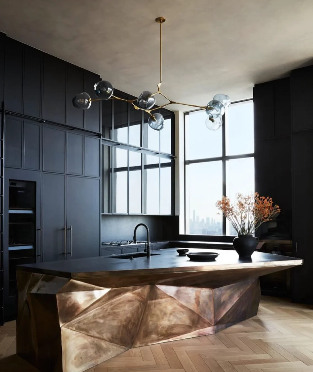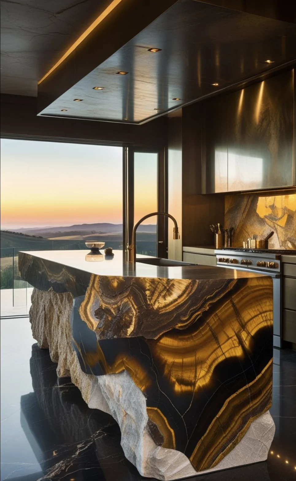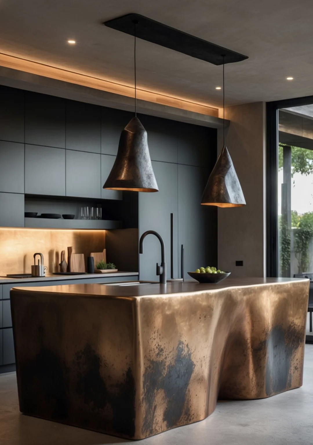 - 金属质感台面:铜/青铜材质的雕塑感造型,每一道褶皱都是手工的温度,让厨房成为艺术装置。