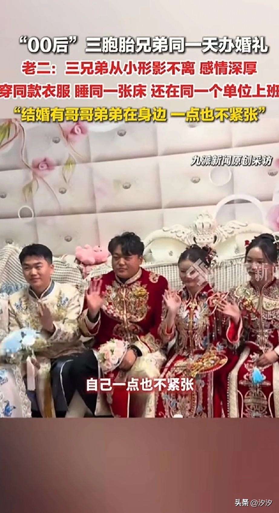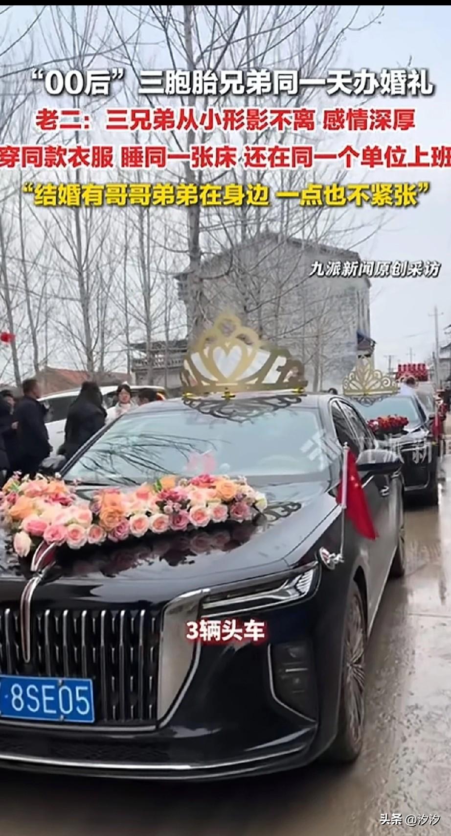 00后三胞胎结婚了, 而且三兄弟还是同一天结婚, 这一场婚礼直接震惊了当地, 很多当地的人都来看了, 三兄弟和三位新娘, 每个新娘都有三位伴娘, 光车队就有20多辆车, 参加这场婚礼的人都觉得很有趣, 因为三个双胞胎在同一天结婚, 确实很有吸引力, 而且三位新娘都同意了这事, 他们的父母也都很乐意, 三兄弟从出生的时候就在一起, 睡同一张床,上同一所大学, 没想到工作之后在同一家单位, 结婚还在同一天, 这样的事想想都厉害, 可惜娶的三个新娘不是三胞胎, 如果是三个三胞胎的新娘, 那就太好玩了, 这样的婚礼是不是很有意思呢? 晒出你梦中的婚礼 三胞胎婚事