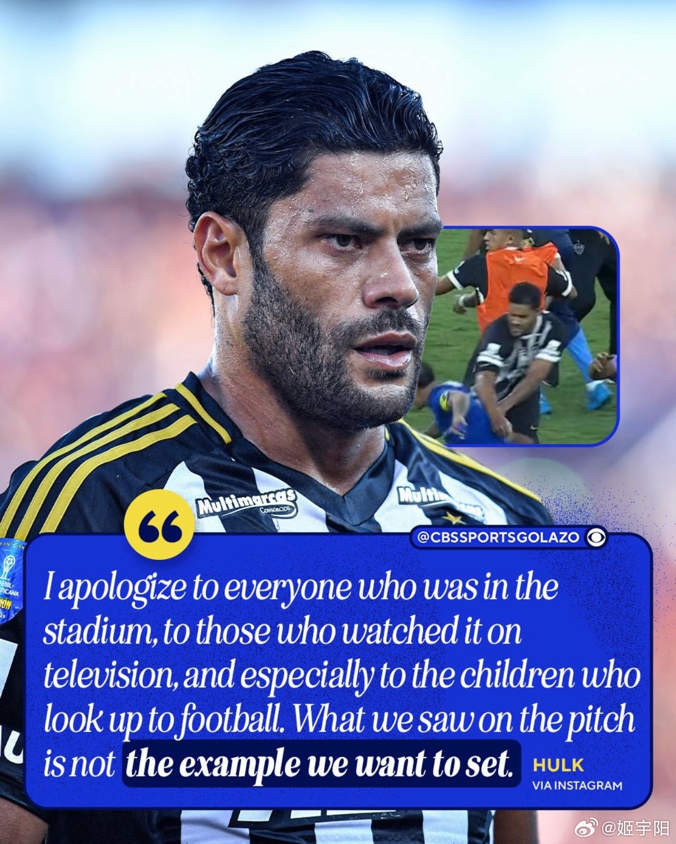 在巴西这场 23 张红牌比赛中,被出示了红牌的球星胡尔克已经在赛后向球迷道歉。他说,我向所有在球场以及在电视机前看了这场比赛的球迷道歉,特别是向那些敬仰热爱足球的孩子们道歉, 在球场里发生的一幕是一个错误的示范。