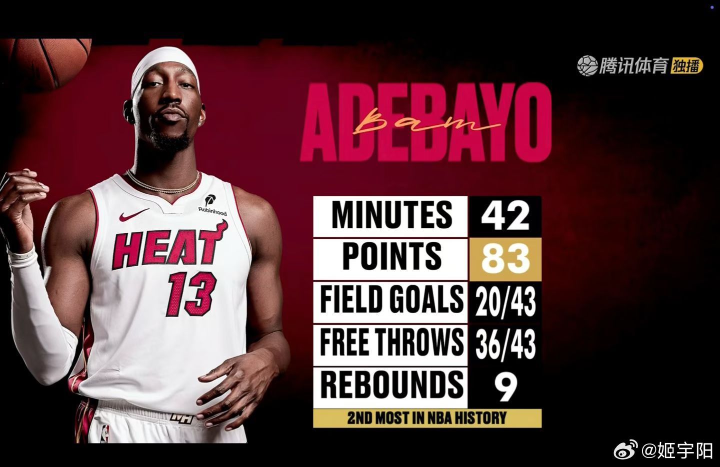 竞技体育的最大魅力之一,就是不断刷新纪录、挑战极限。阿德巴约,在 NBA常规赛热火主场150-129大胜奇才的比赛中,狂砍 83分,超越科比成为历史第二人!仅次于 100 分的张伯伦。单场43罚(36中)更是打破了NBA历史纪录,此前最高是39罚(德怀特·霍华德,2次)。