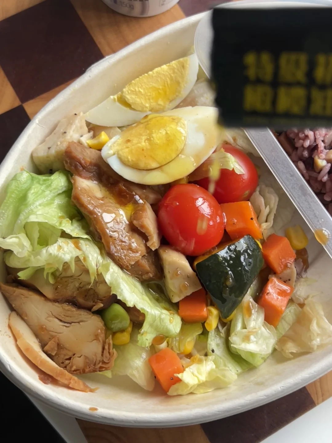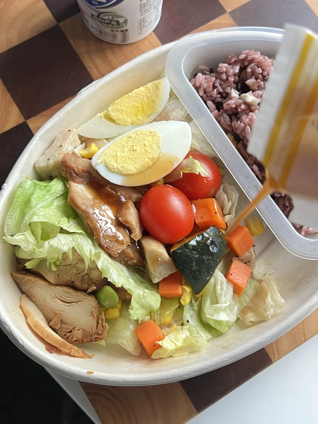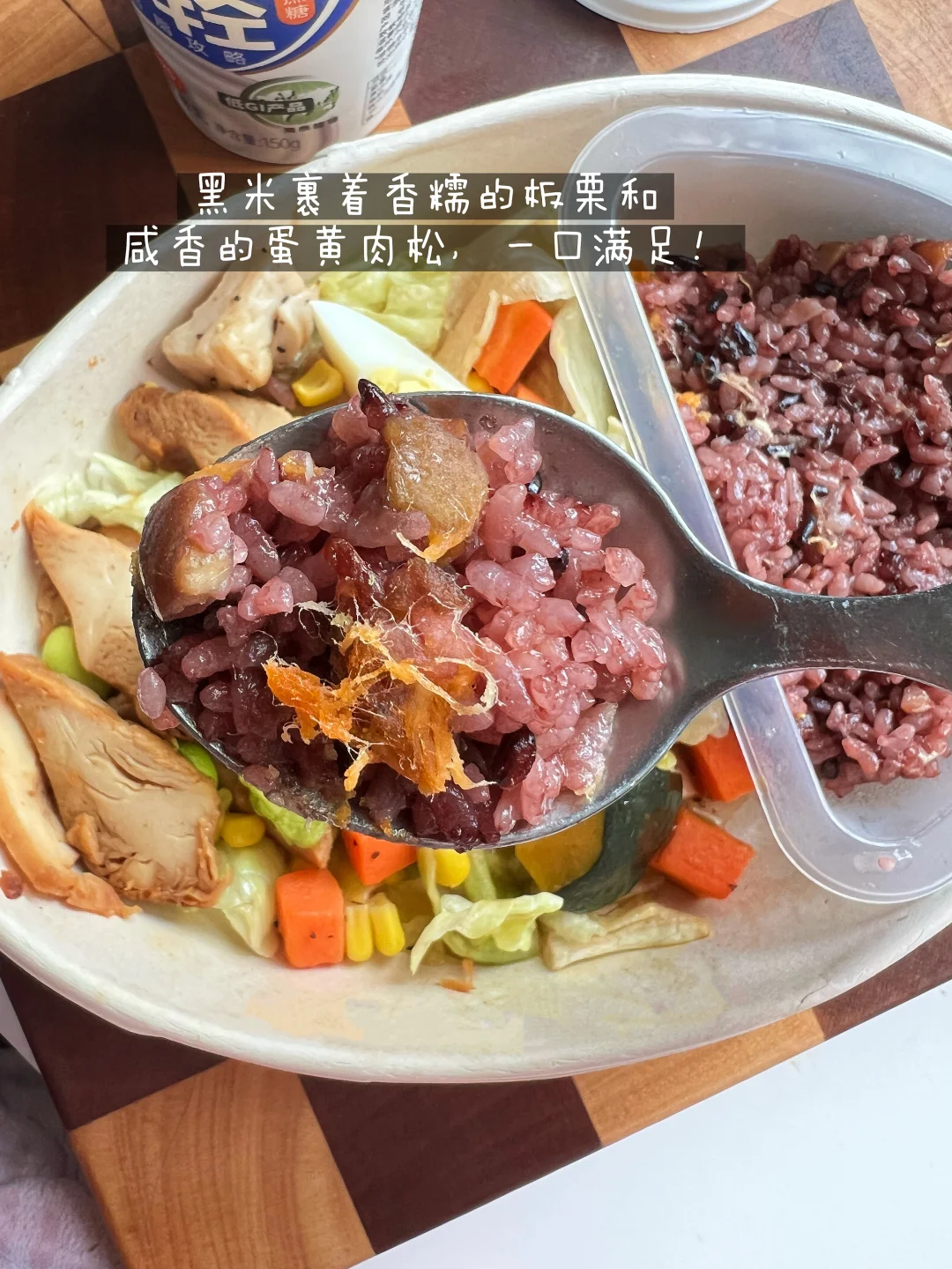 过年大吃大喝体重📈了不少 这会只想吃点清爽的 无意发现一鸣出了好几款能量碗 买了黑米板栗鸡肉能量碗 没想到还给送了酸奶(才14.9💰,😆) 吃的时候淋上日式沙拉汁和橄榄油 黑米裹着香糯的板栗和咸香的蛋黄肉松,一口满足! 搭配的鸡胸肉裹着沙拉汁和橄榄油,嫩而不柴 里面的鸡蛋🥚、胡萝卜🥕、南瓜🎃、小番茄🍅、玉米粒🌽、毛豆🫛,都是我爱的! 特别是脆爽的生菜🥬 大大提升了口感,这性价比性值了👍👍