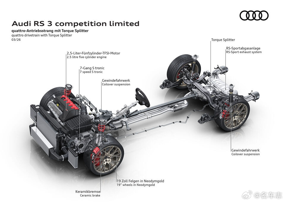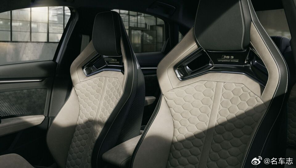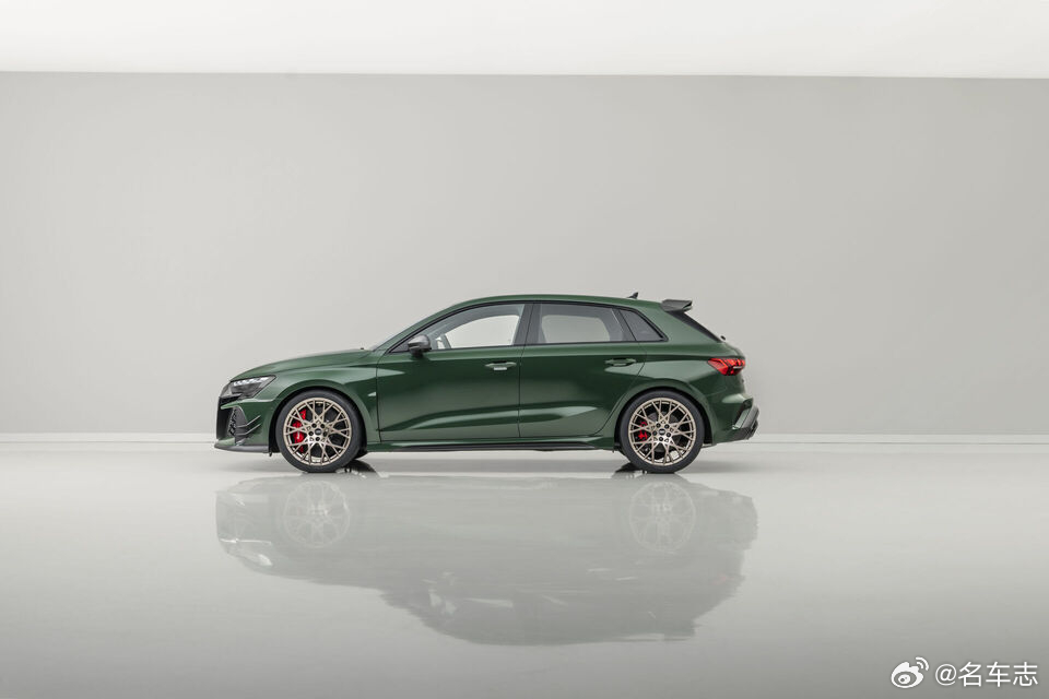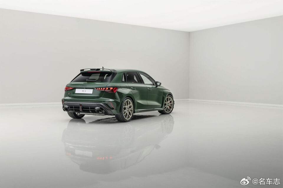 名车志新闻 【庆祝五缸发动机诞生50周年,奥迪推出RS3 Competition Limited】· 新车搭载2.5TFSI直列五缸涡轮增压发动机,输出400马力与500牛·米扭矩,0-100 km/h加速仅3.8秒,配以标志性的1-2-4-5-3点火顺序声浪,并通过RS运动排气系统与减少防火墙隔音,让驾驶者更直接感受其“嗓音”;· 底盘方面首次引入三向可调绞牙避震(高低速压缩+回弹独立调节)及加粗后稳定杆,搭配碳陶刹车与倍耐力 Trofeo R半热熔胎,赛道性能大幅提升;· 外观采用专属Malachite Green哑光绿车漆、碳纤维前唇/侧裙/后扰流板、19英寸Neodymium金轮圈,LED大灯解锁时以五缸点火顺序点亮;· 内饰则以黑/金/姜白三色主题、Dinamica微纤维桶椅、碳纤维饰板及中控台连续编号铭牌彰显稀有身份;· 该车提供Sportback与Sedan两种车身,德国起售价分别为108,365欧元和110,005欧元,限量750台,2026年中开始交付。