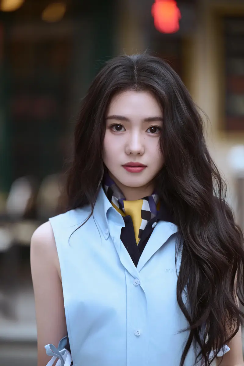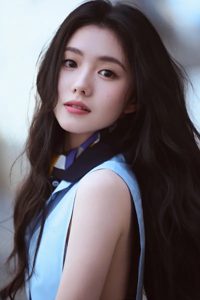 刘浩存身着浅蓝无袖衬衫眉眼清澈 单手托腮清新灵