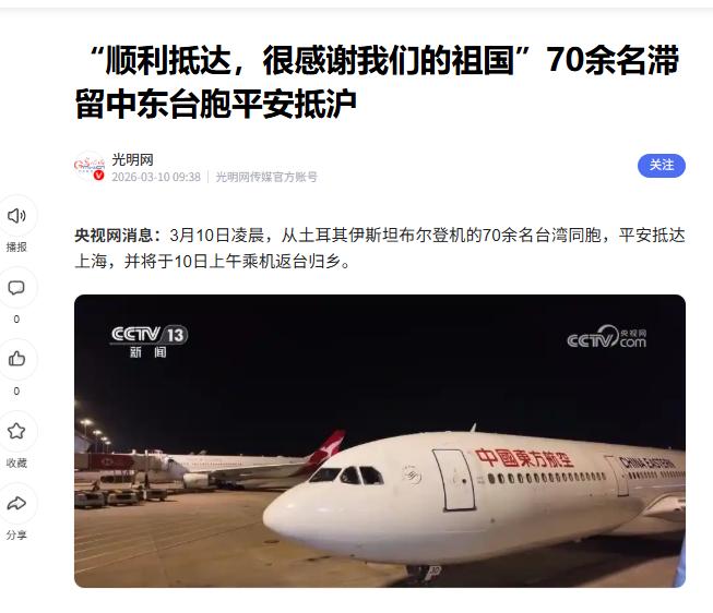 无台胞证也能回!3月10日凌晨4时,搭载70余名台胞的MU704航班平安抵达上海浦东国际机场, 这是2月底中东局势升级以来,经中国大陆中转返台人数最多的一批台胞旅客。   2月底,中东突然打起来了,炮弹满天飞,机场说关就关,航班说停就停,原本计划从土耳其伊斯坦布尔转机回台湾的近百名同胞,直接被困在了机场。   大家带的换洗衣物不够,当地饮食也不习惯,最难受的是心里慌,这仗啥时候能停?啥时候能回家?   更气人的是台当局的态度,他们嘴上说“密切关注”,实际上连个包机都协调不了,更别说安排边境通行了。   正当众人几近绝望之际,转机悄然而至。中国驻以色列使馆紧急发布通知,明确“台胞证亦可登记撤离”,并开启了从塔巴边境通往埃及的通道,带来生的希望。   与此同时,中国驻伊斯坦布尔总领馆接获求助后,即刻与国内及航空公司沟通协调,为七十余名求助者改签航班,助其直飞上海,再转机顺利返回台湾。   3月10号凌晨的浦东机场,一场“和时间赛跑”的行动开始了,上海边检总站提前跟航空公司对好名单,安排警察引导分流;公安出入境部门更绝,专门给没带台胞证的20多人开了“凌晨专窗”,现场拍照、制证,全程只要几分钟。   上午9点15分,第一批人坐飞机去了台北;中午12点05分,剩下的人也到了桃园机场,这场跨越中东、土耳其、中国的“生命接力”,总算圆满完成。   这次撤侨,把民进党当局的“领事保护”谎言撕了个粉碎,就在大陆忙着协调撤离的时候,台“外交部”居然发声明,说“找大陆帮忙有风险”,民进党的人还造谣这是“矮化台湾”,可事实呢?   从利比亚、也门、苏丹到这次中东,每次有危险,大陆都把台湾同胞当自己人,累计帮了好几万人安全回家。   这次中东危机,他们只安排了2个人从陆路撤到约旦,对几千个被困的人说“暂时没撤侨计划”,连个包机都协调不了,更别说开边境了。   “关键时候,能救你的不是嘴上的漂亮话,是祖国的真本事,2025年两岸人员往来超过500万人次后,大陆持续优化台胞入境政策,展现关怀与诚意。 不仅扩大“落地办证”口岸范围,还为初来大陆的台胞免除证件费用,极大便利台胞在大陆的出行、工作与生活。   作为一个普通老百姓,这次撤侨让我明白:不管政治立场有啥分歧,在生死关头,两岸同胞的血脉联系是割不断的。   民进党当局天天喊“保护台胞”,可真出了事,却把老百姓的命当政治筹码,而大陆用行动证明,“台湾同胞是中国公民”不是口号,是刻在骨子里的责任。   更气人的是,台当局为了阻止两岸交流,居然编造“找大陆帮忙有风险”的谎话,想让老百姓不敢跟大陆打交道。   但历史早就证明,从2011年利比亚撤侨到这次中东行动,每次有危险,台胞证都是“救命符”,大陆的领事保护从没掉过链子,那些被台当局忽悠的人,早晚会明白:只有承认一个中国,靠上强大的祖国,才能在风雨里真正安心。   两岸统一是大势所趋,老百姓的心也早就往一块儿聚了,希望台当局别再为了自己的私利,拦着两岸交流了,让更多台湾同胞享受到祖国发展的好处,不好吗?毕竟,血浓于水,家,永远是最温暖的港湾。