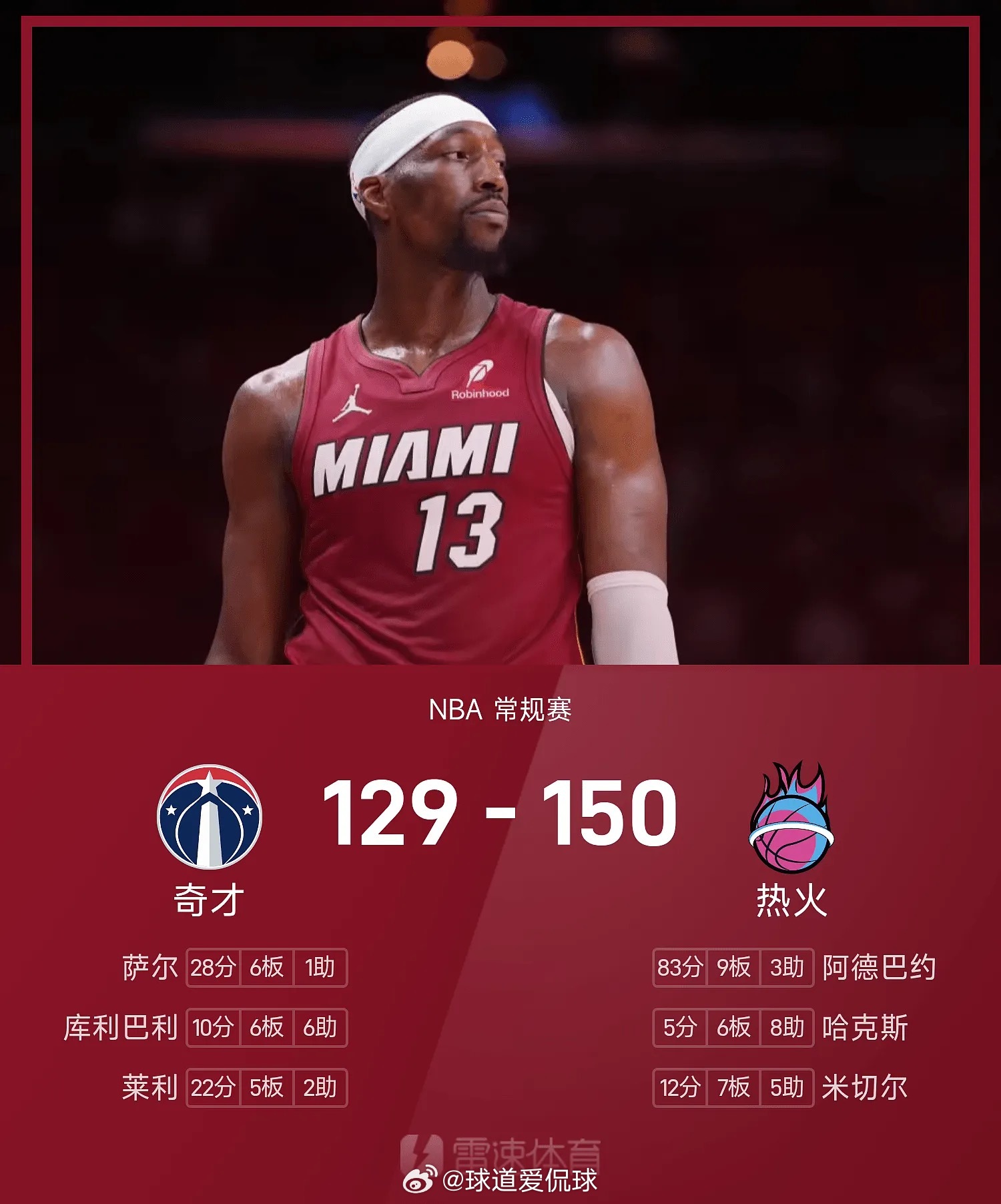 末节较量,双方开场先后轰出得分小高潮,热火继续扩大领先优势,当阿德巴约打成2+1后,其个人此役得分达到70分,成为本赛季首位单场得分70+球员,热火大比分领先。随后,阿德巴约继续取分,末节还剩97秒,阿德巴约2罚2中,拿到81分追平科比。而后,阿德巴约再度2罚2中,拿到83分,创造历史单场第二高分。最终,热火150-129奇才。